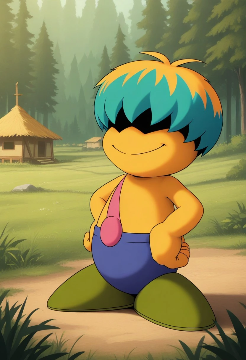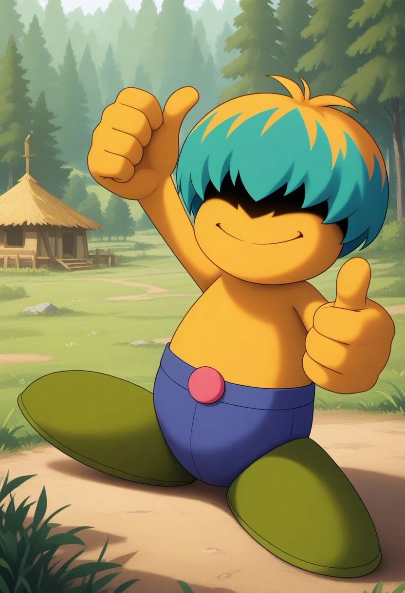 Tuff, yellow skin, teal hair, no eyes, , blue shorts, green shoes