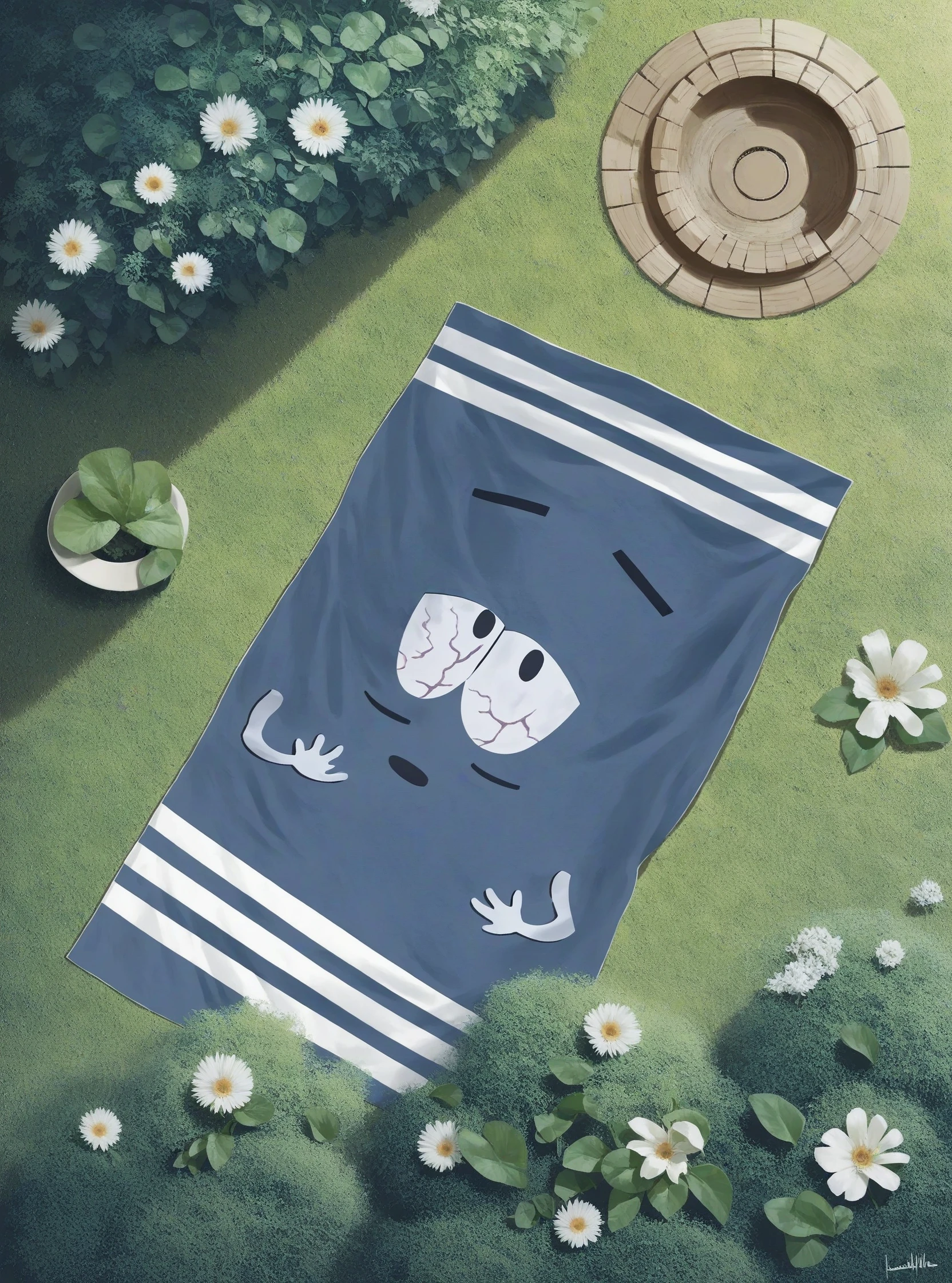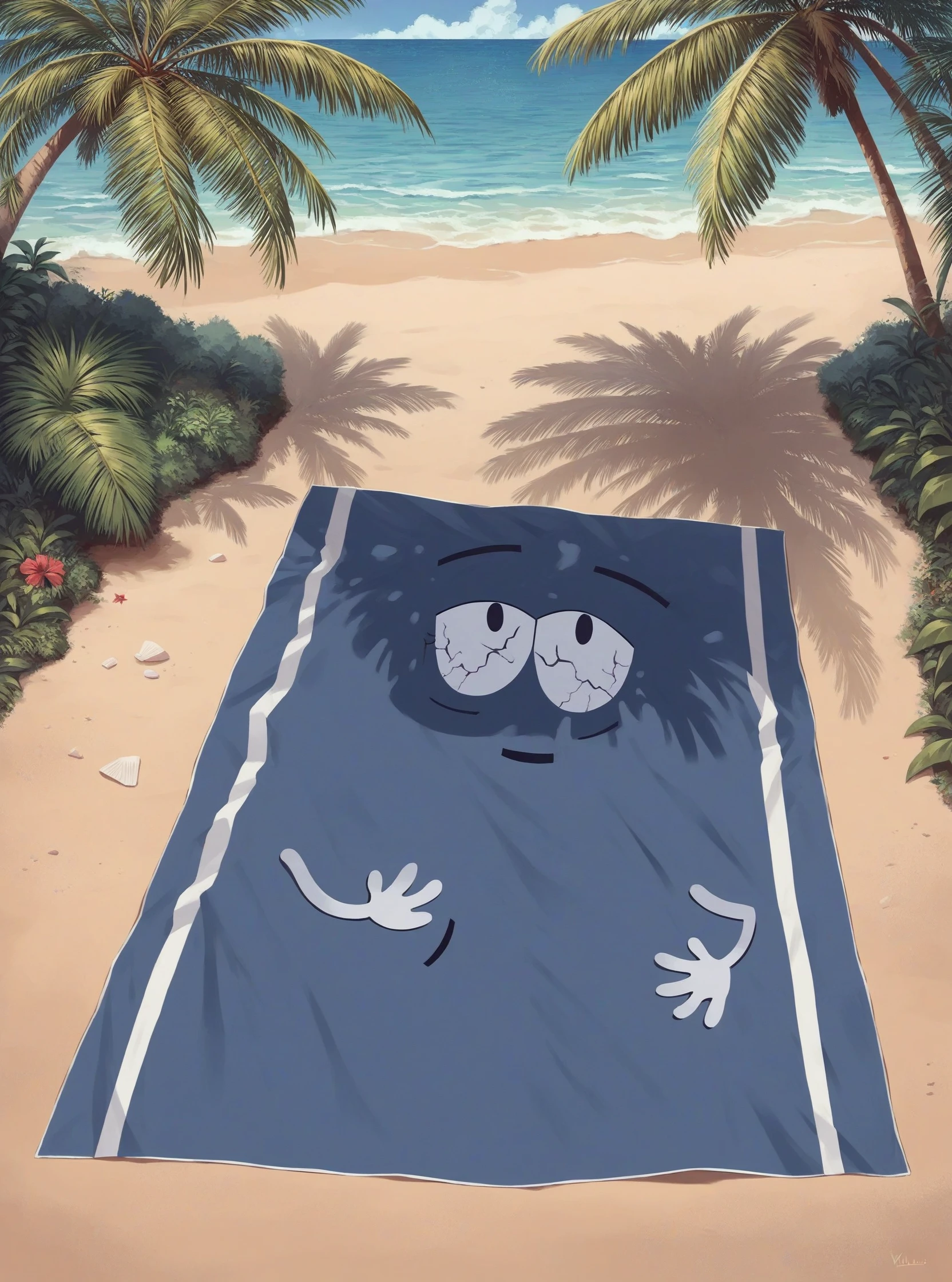 Optional: beach towel, no humans, from above, ocean, pool, palm tree, flip flops, sunglasses, seashell