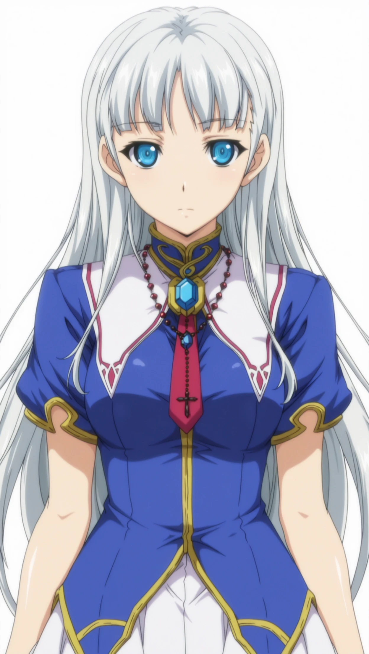 sherrywhite, 1girl, long hair, silver hair, blue eyes, medium breasts, cross necklace, gem, necktie, dress, short sleeves, skirt, white skirt