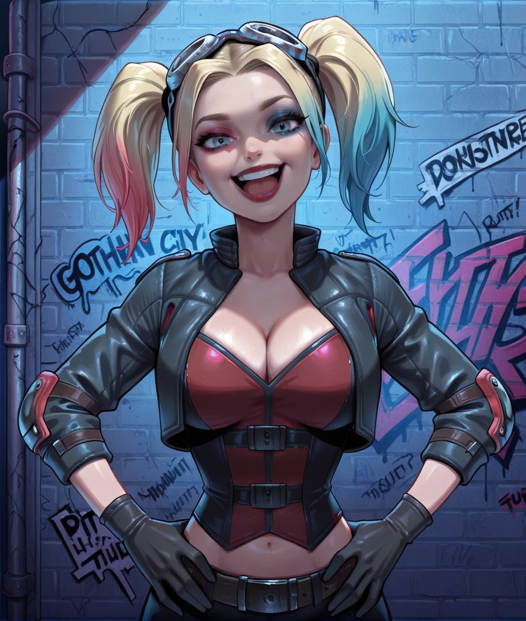 Harley, blue eyes, -- low twin tails, blonde hair, - facial mark,