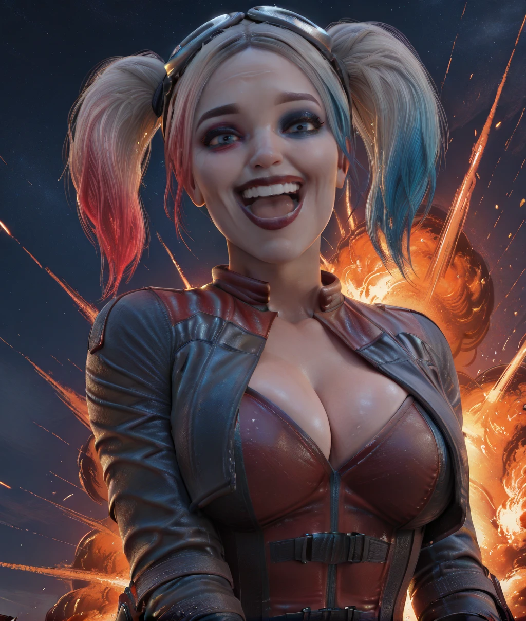 Harley, blue eyes, -- multicolored hair, blonde hair, twin bun, or double bun, - makeup, lipstick,