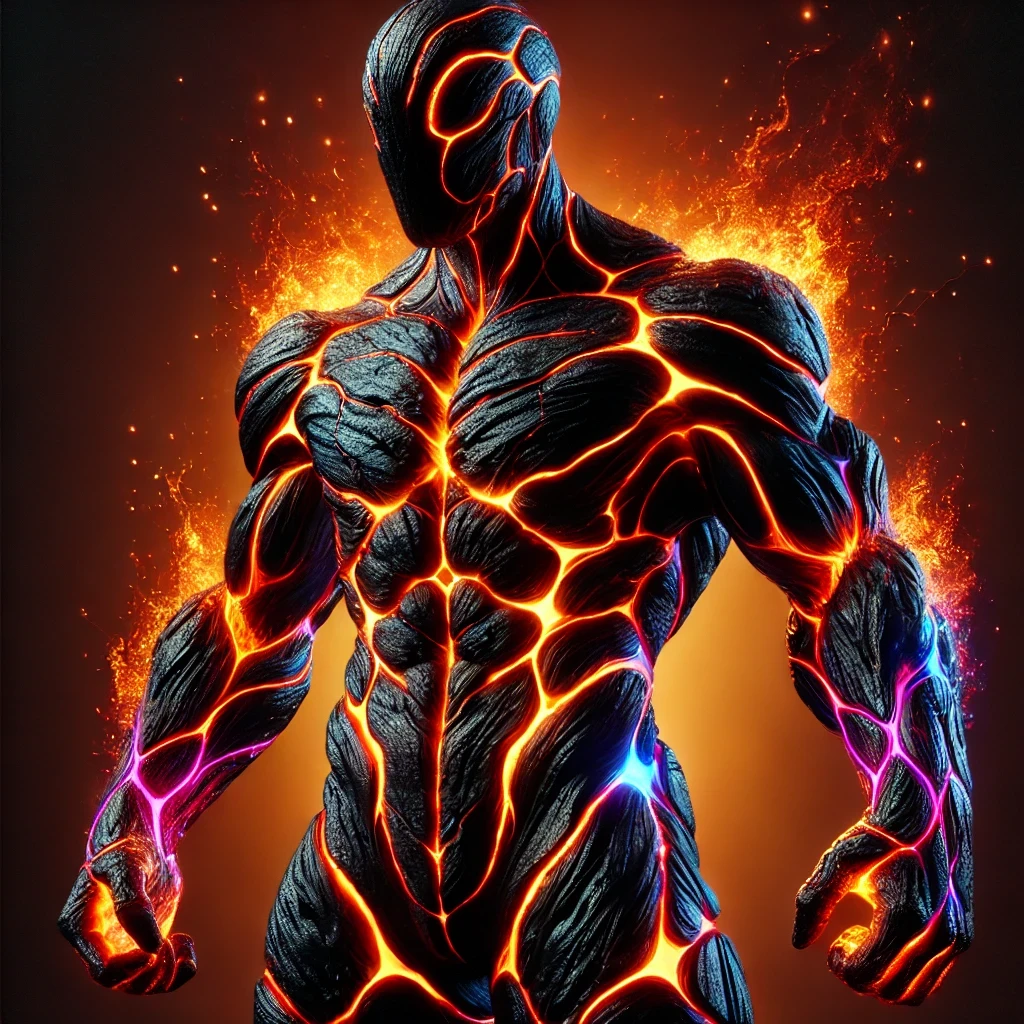 "A powerful humanoid figure composed of solid black material, covered in glowing molten cracks resembling lava. The figure radiates intense energy, with flames flickering from its body, emphasizing its muscular form. A dark gradient background transitions from deep fiery orange to black, enhancing the dramatic effect. The flames interact dynamically with the environment, casting a warm glow and shadows across the figure's surface. Sparks and embers float around, adding depth and realism. The figure stands in a dominant pose, exuding unyielding strength, with a glowing molten core visible through its cracks. High-detail textures, cinematic lighting, and a hyper-realistic rendering style make the image feel immersive and intense."