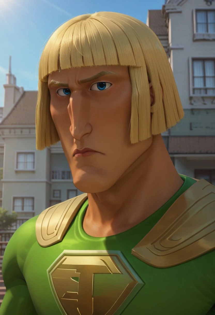 1boy, solo, mrjustice_HI, olive skin, blue eyes, golden hair, hairstyle bob cut, short hair, wide shoulders, broad chest, defined arms