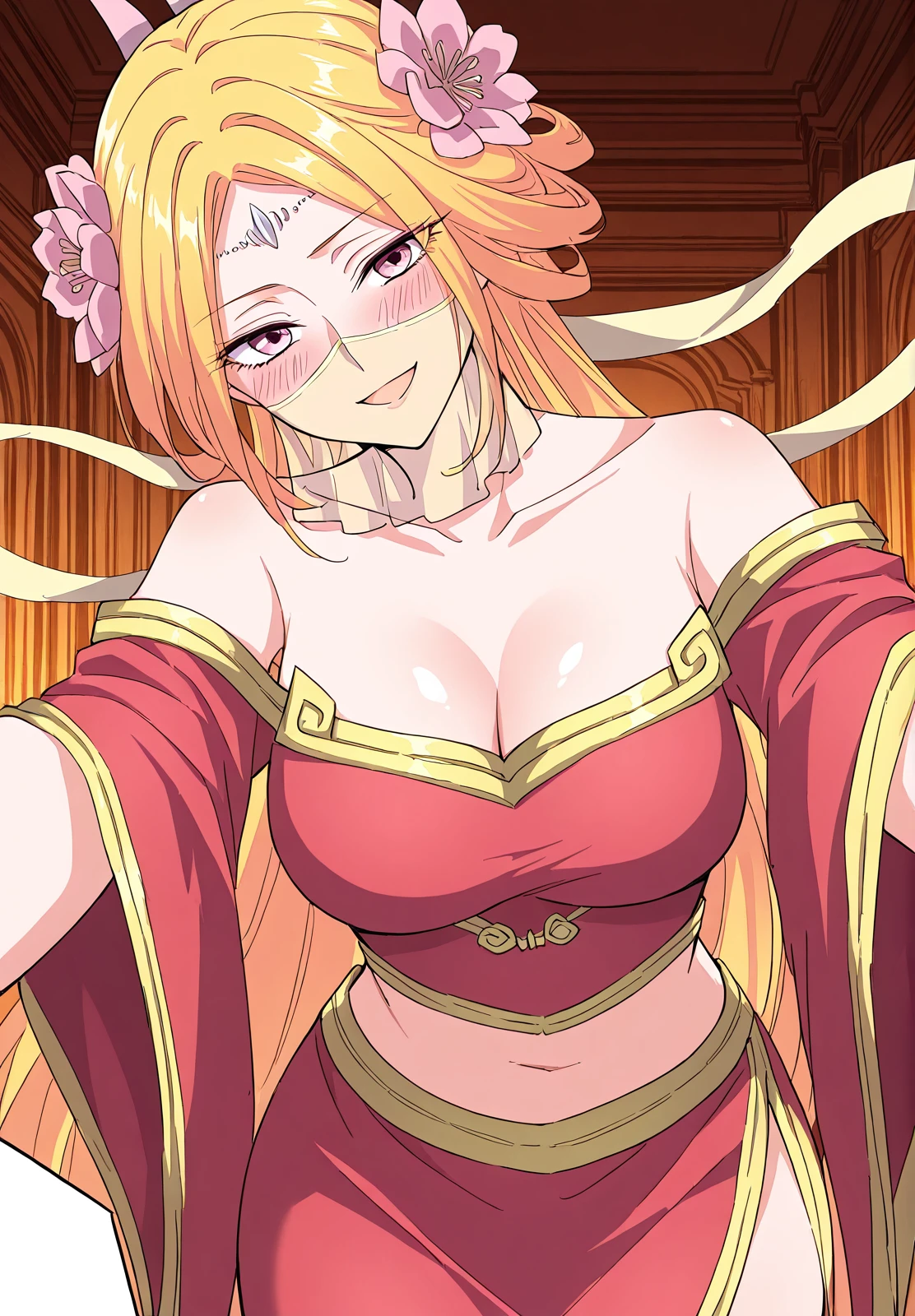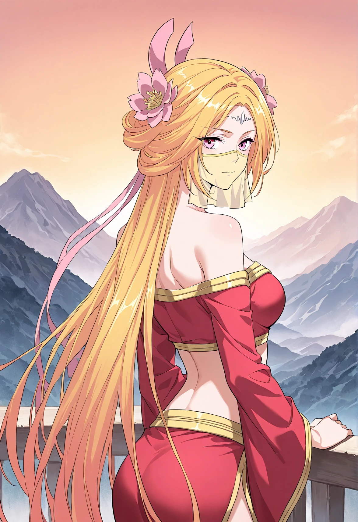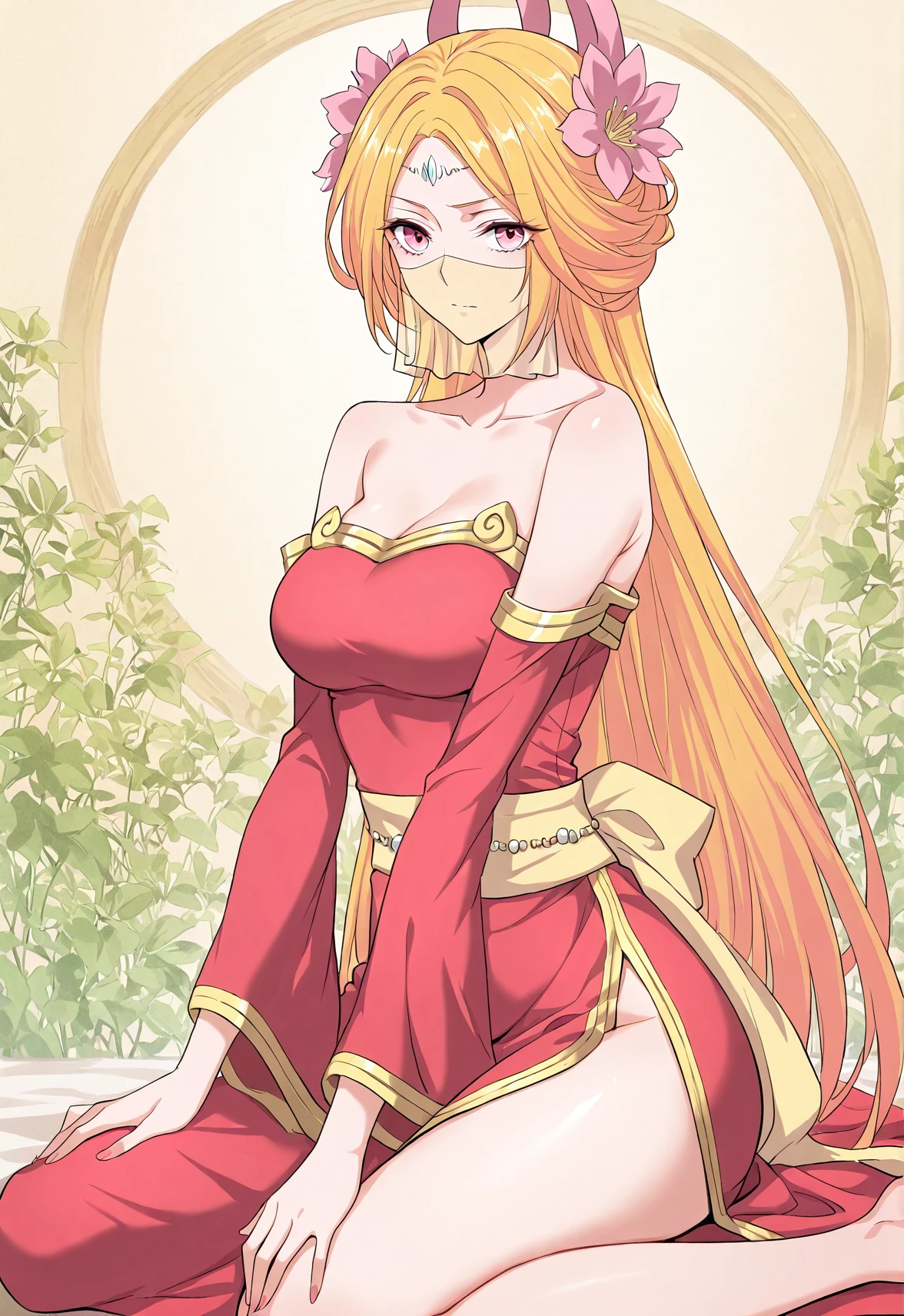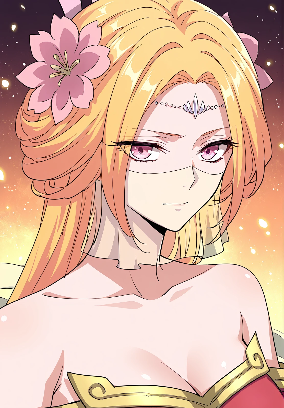 1 girl, solo, long blonde hair, orange-pink gradient hair, straight hair, twin horn-like accessories, flower hair ornaments, forehead jewel, pink eyes, face veil,