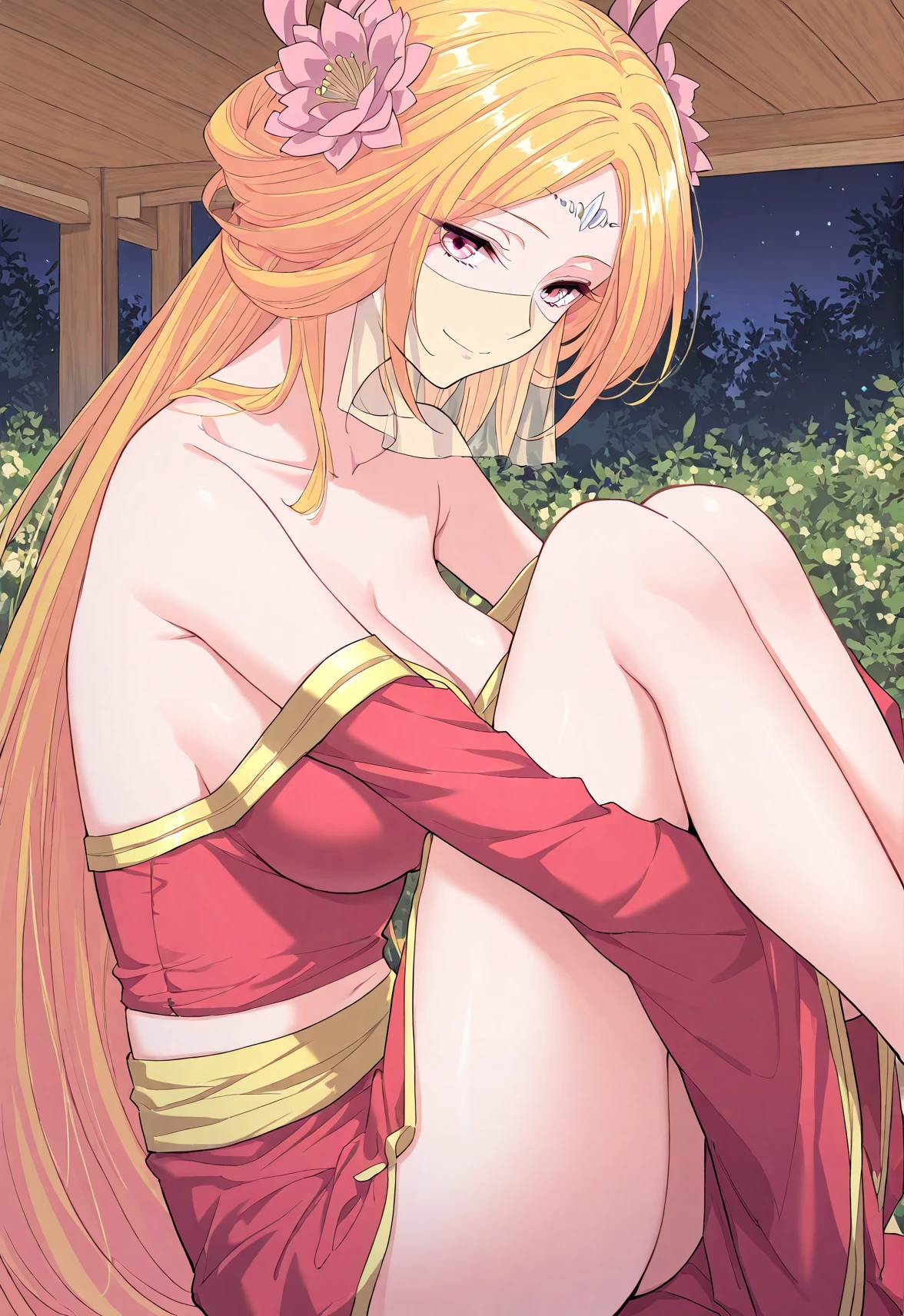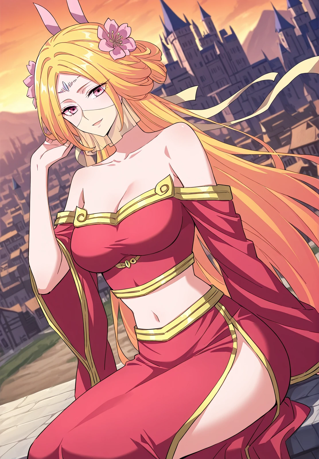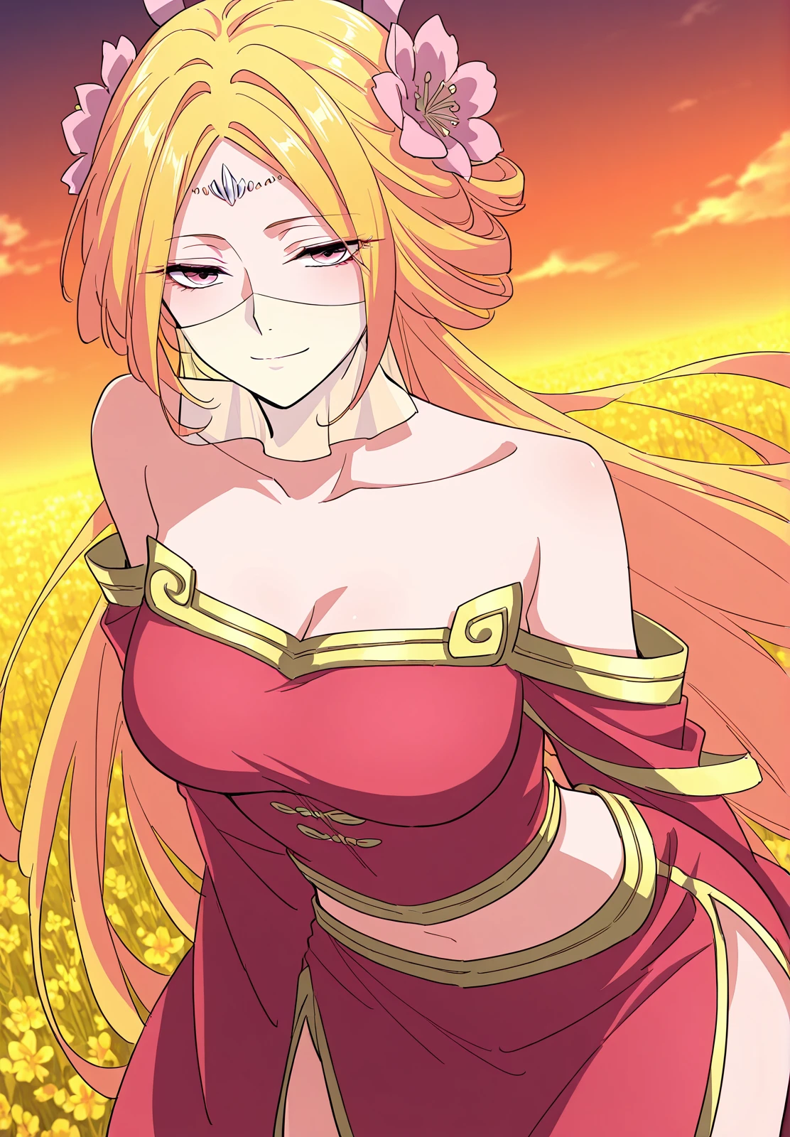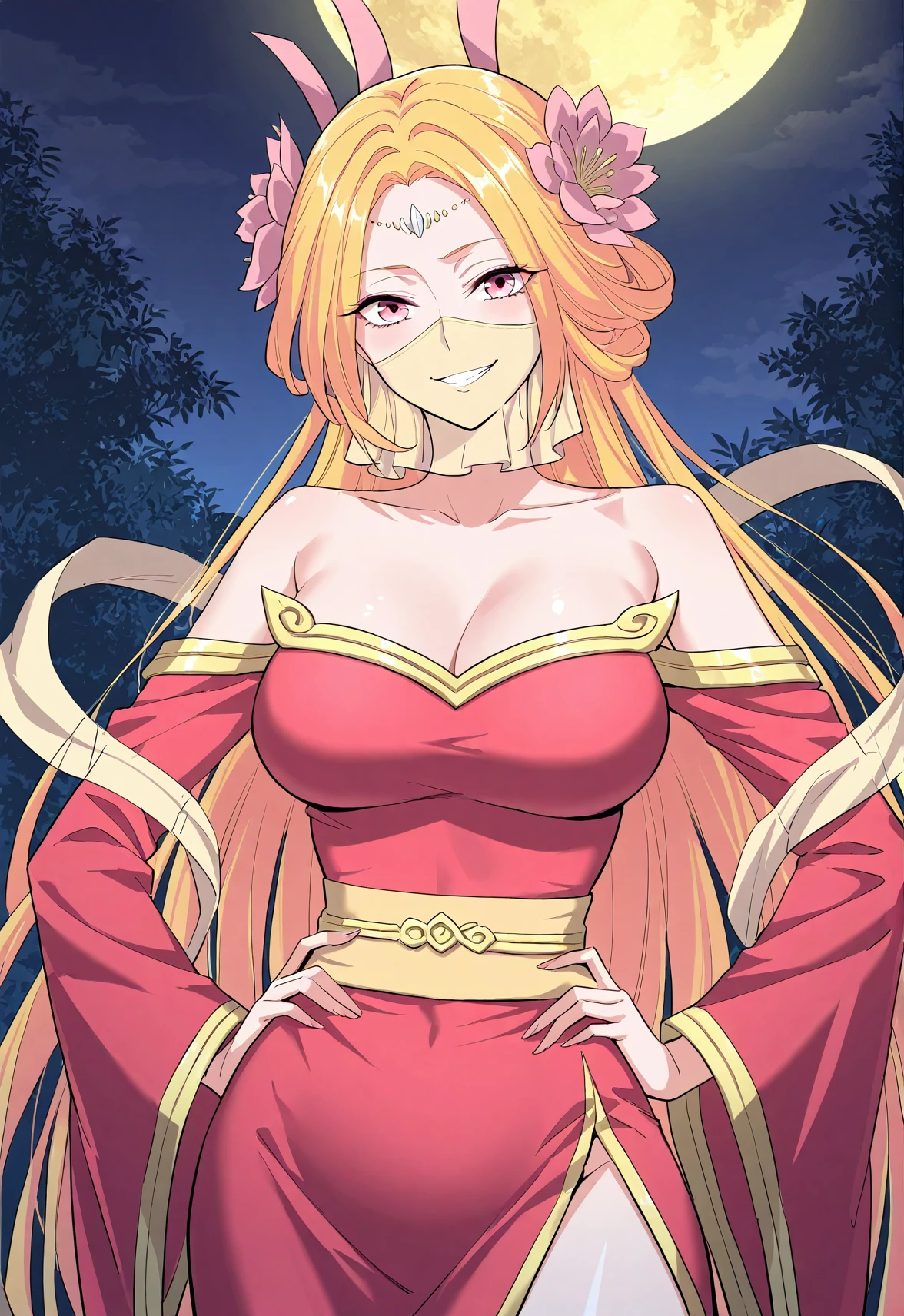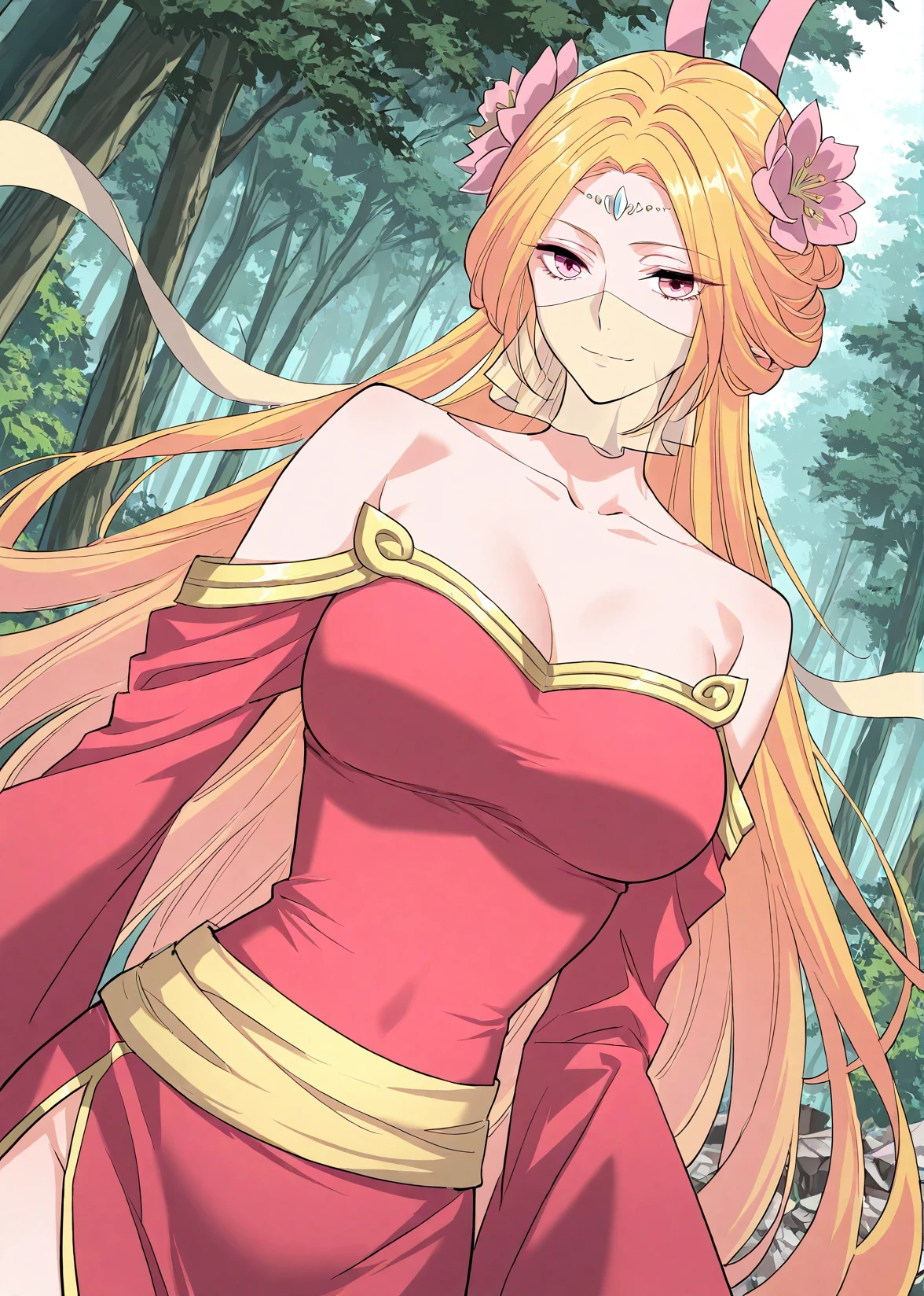 1 girl, solo, long blonde hair, orange-pink gradient hair, straight hair, twin horn-like accessories, flower hair ornaments, forehead jewel, pink eyes, face veil,