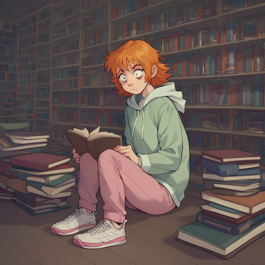 Alche, W.I.T.C.H., 1girl, solo, solo focus, green eyes, short hair, orange hair, oversized hoodie, long sleeves,