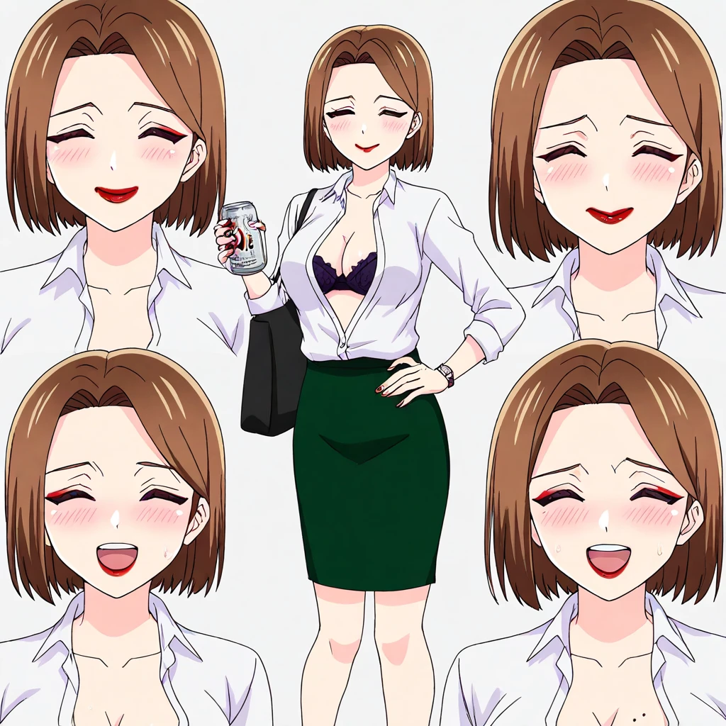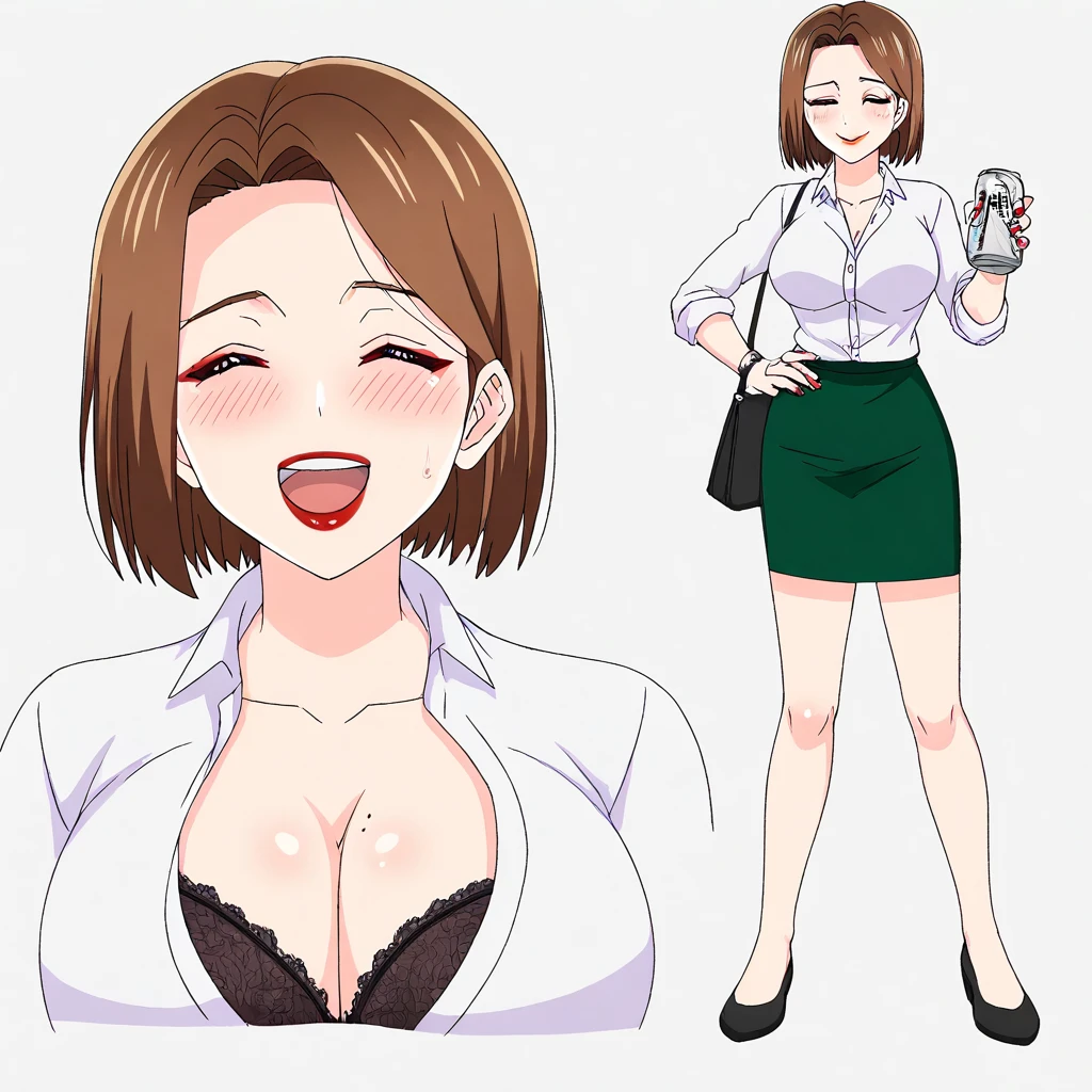 Kooriyama Yui, young woman, brown eyes, medium hair, brown hair, hair styled in a bob cut, pink lips, parted lips, white office shirt, dark green pencil skirt , skirt, shirt, long sleeves, nail polish, mole, mole on breast, jewelry,