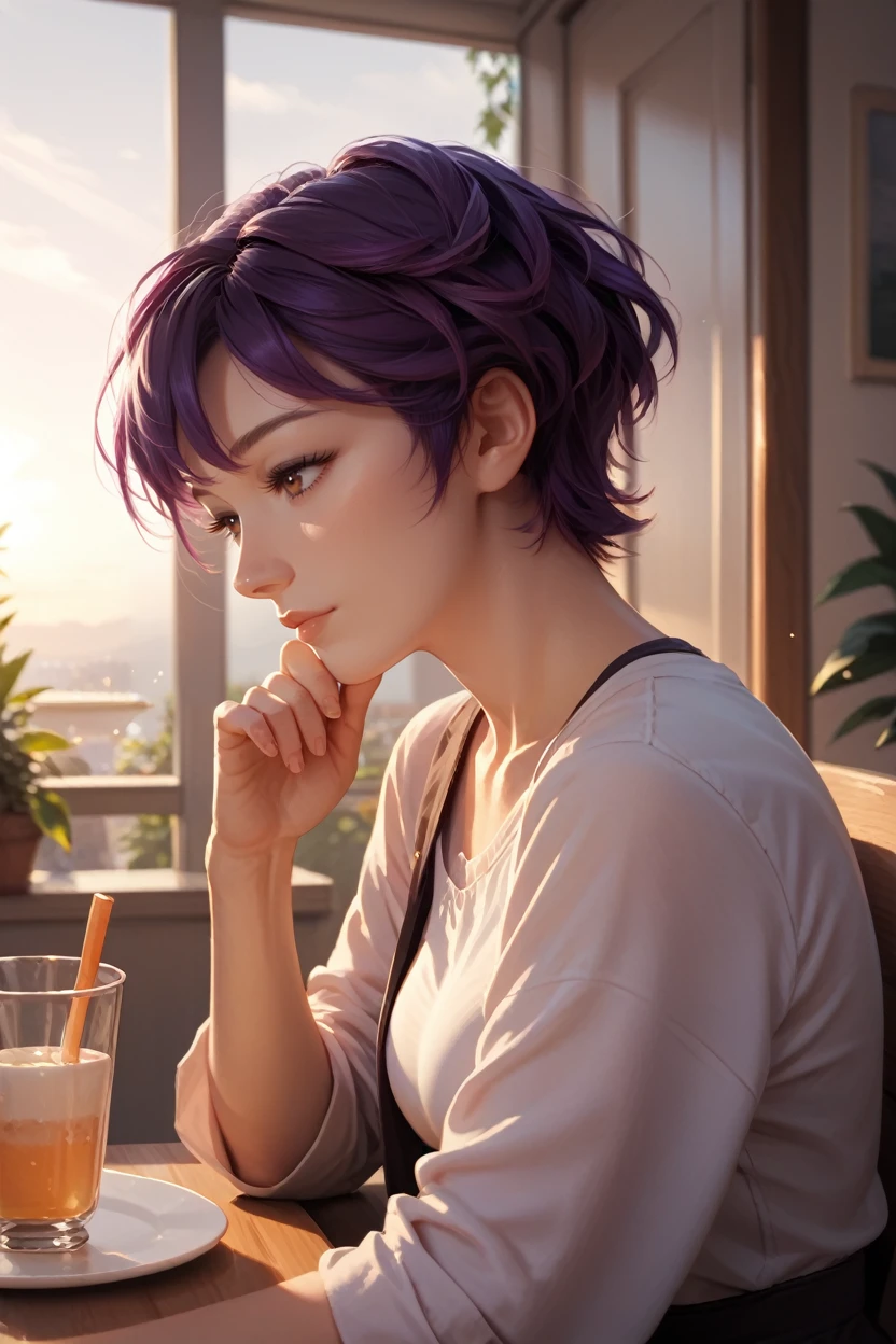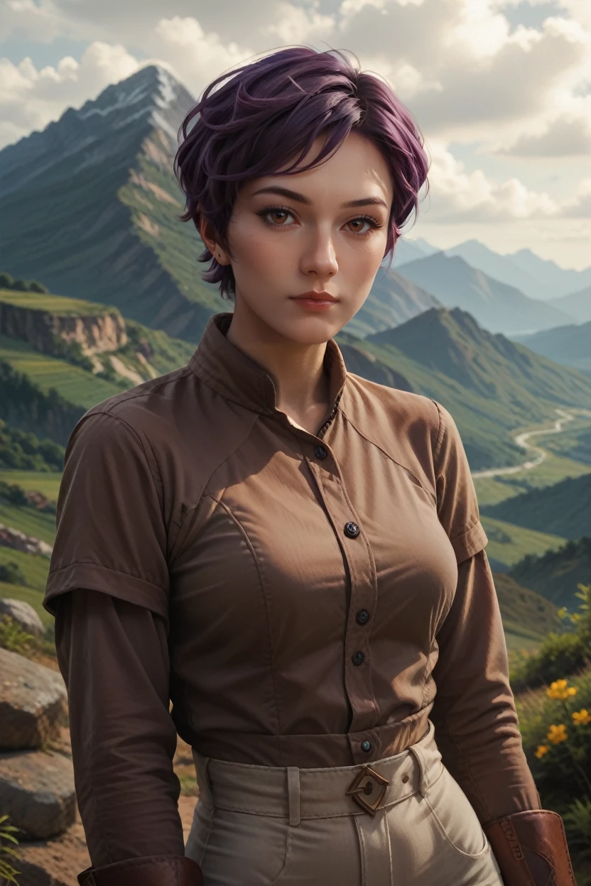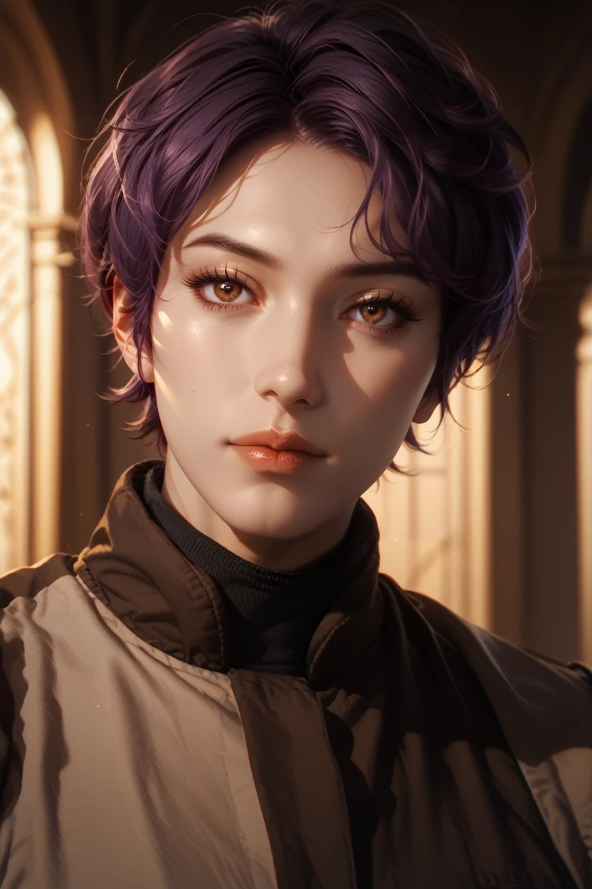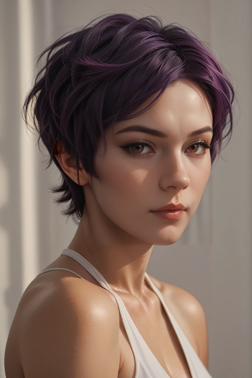 sabinenh, 1girl, purple hair, short hair, brown eyes