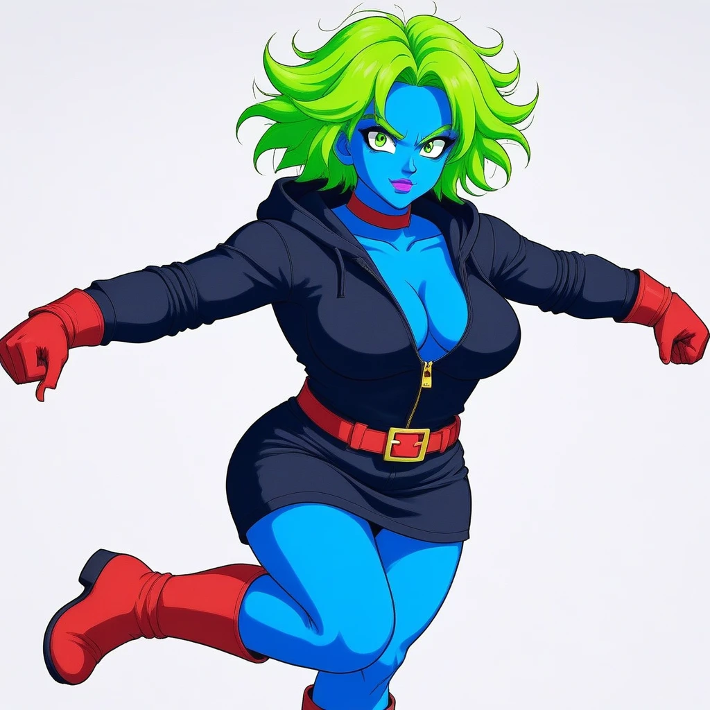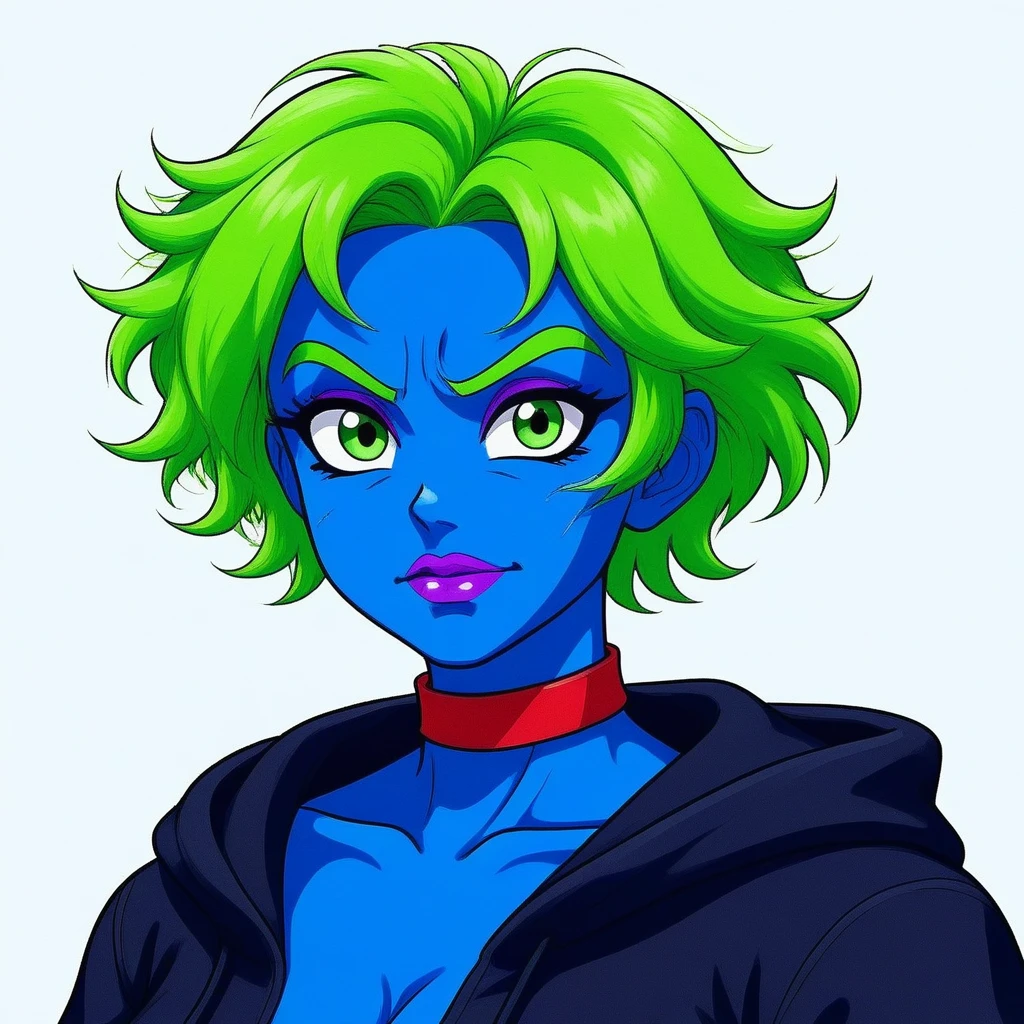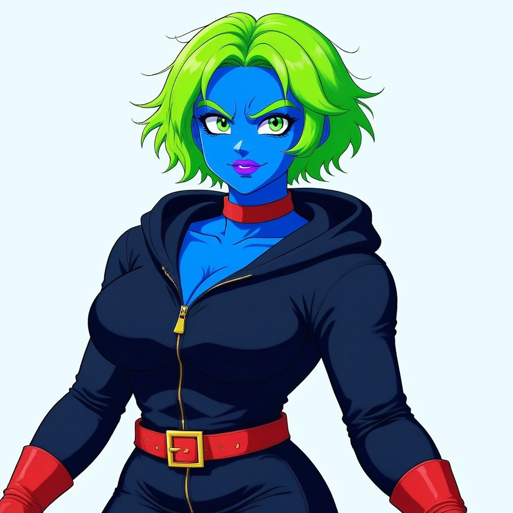 Example full-body positive prompt tags (copy-paste ready – add weights like (lime green hair:1.2) if needed): jodiblue, blue skin, cyan skin, bright blue skin, lime green hair, neon green hair, short hair, bob haircut, voluminous hair, messy hair, green eyebrows, matching hair color, large green eyes, emerald green eyes, detailed eyes, long eyelashes, purple eyeshadow, magenta eyeshadow, pink-purple makeup, purple lips, magenta lips, glossy lips, full lips, friendly expression, polite smile, soft smile, gentle look, warm expression, red choker, simple red choker, neck choker, black hoodie, hoodie hood, red hoodie drawstrings, red hoodie cords, zipped hoodie, deep cleavage, large breasts, cleavage, black skirt, short skirt, above knee skirt, red belt, red belt with yellow buckle, gold belt buckle, long red gloves, elbow length red gloves, red armwear, red knee high boots, red thigh high boots, standing, full body, looking at viewer, anime style, anime girl, vibrant colors, cel shading, clean lines, sharp outlines, high detail, masterpiece
