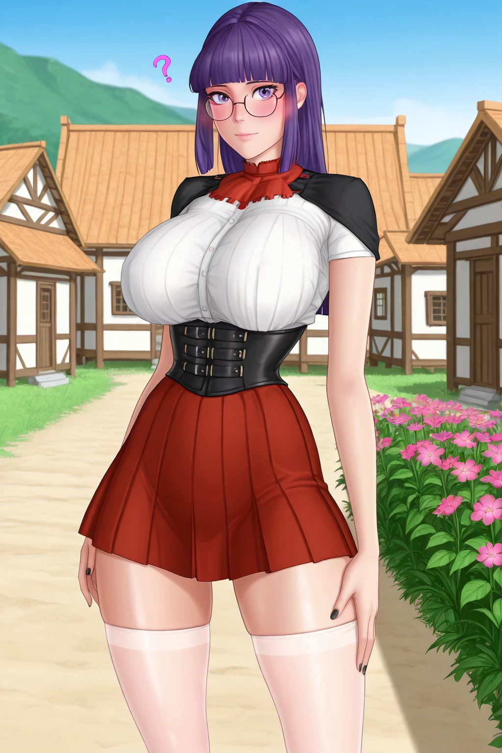 Rina, long hair, purple eyes, purple hair, glasses, blunt bangs, hime cut, blunt ends, white shirt, short sleeves, pleated skirt, miniskirt, white thighhighs, uniform, capelet, red skirt, underbust, black corset, ankle boots, high heels, black footwear