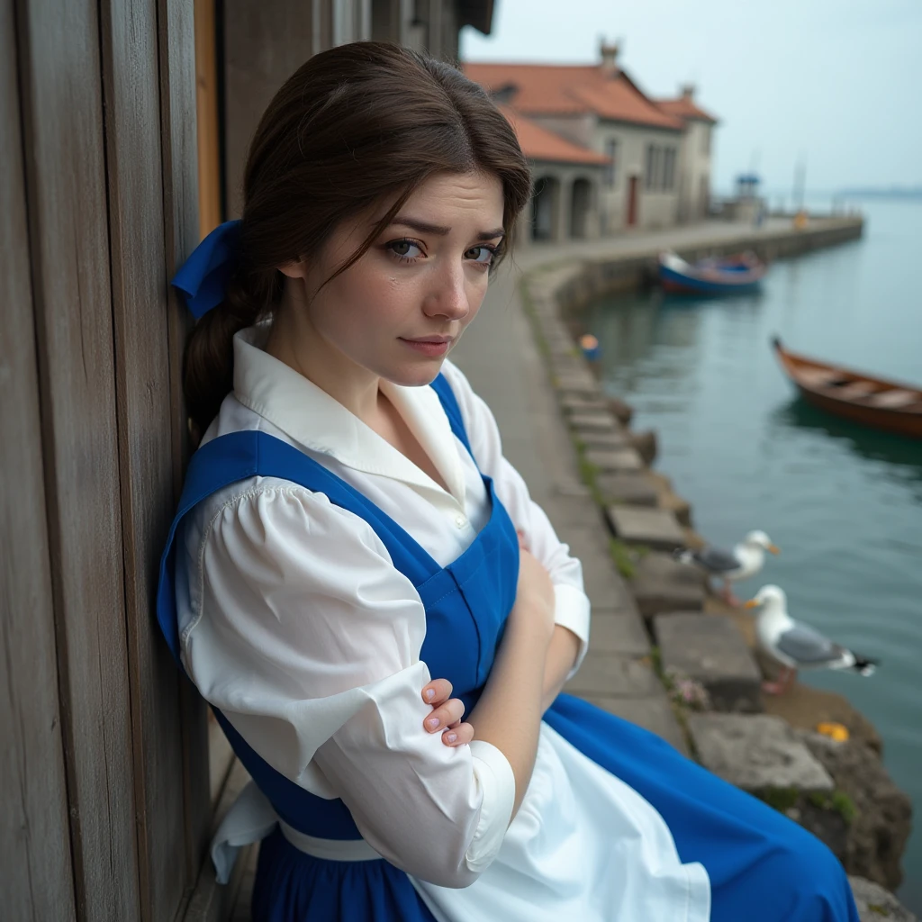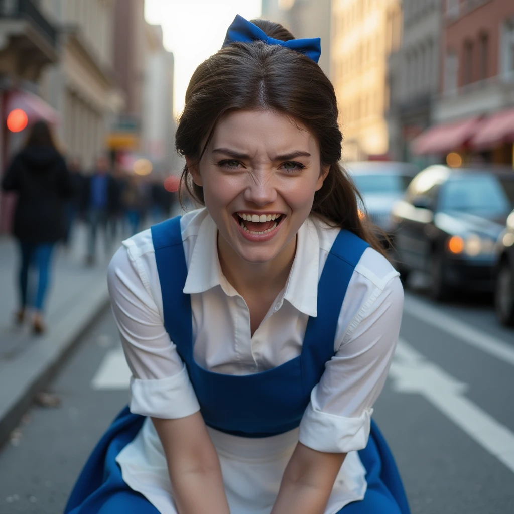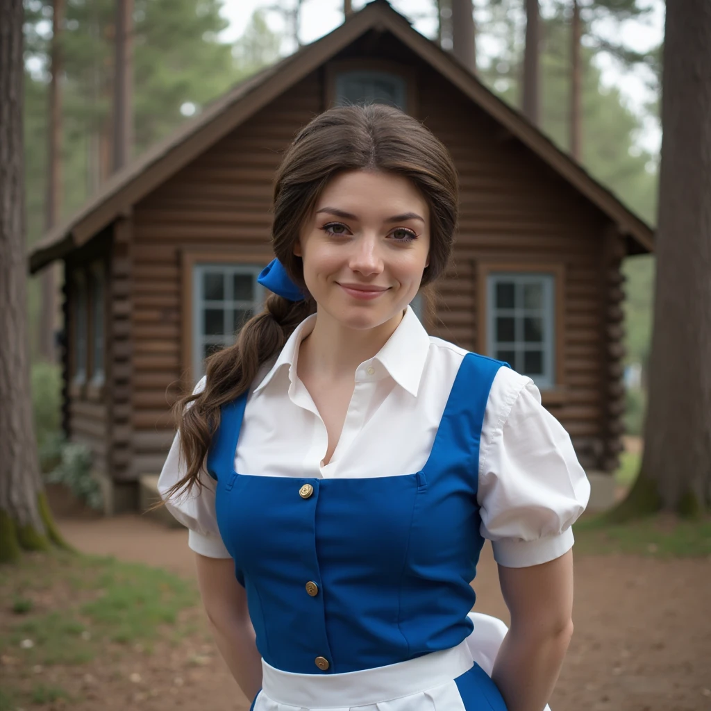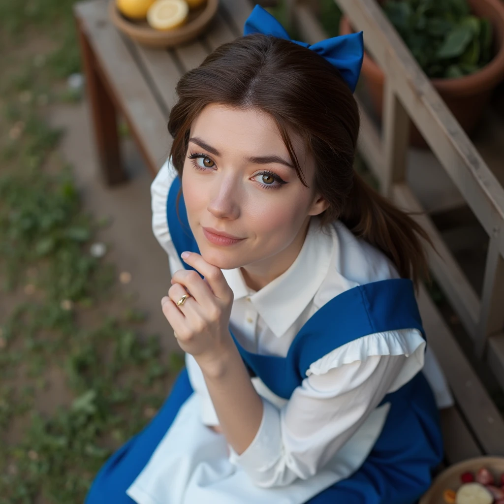 Belle - {Belle_\(Beauty and the Beast\) cosplay, dark brown hair, brown eyes, ponytail, blue ribbon, white blouse, blue dress, white apron}