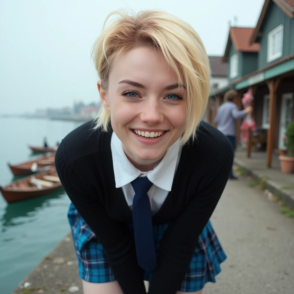 Gwen - {gera6cpec, blonde hair, asymmetric hair, blue eyes, eyebrow piercing, white collared shirt, black sweater with blue tie, blue plaid skirt}