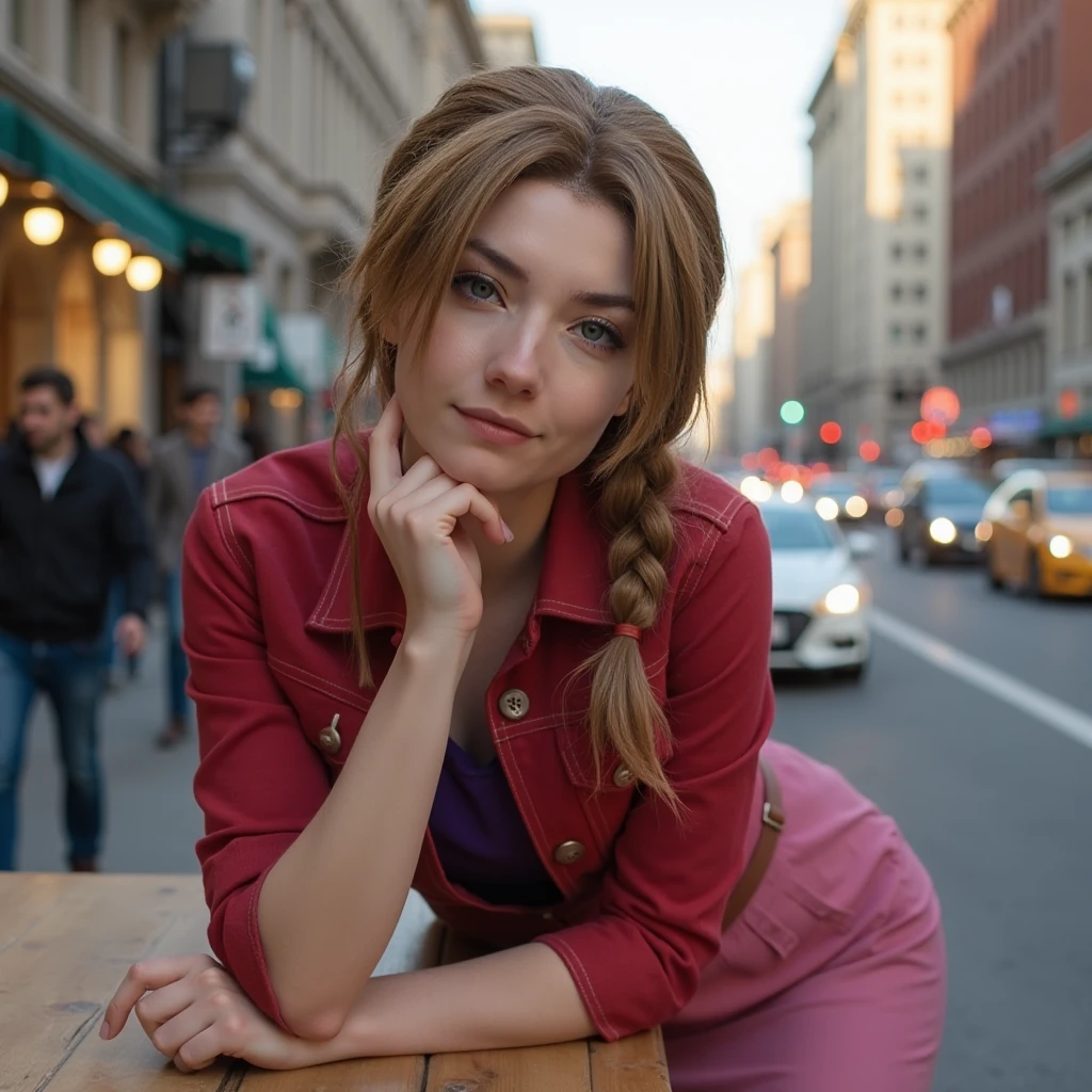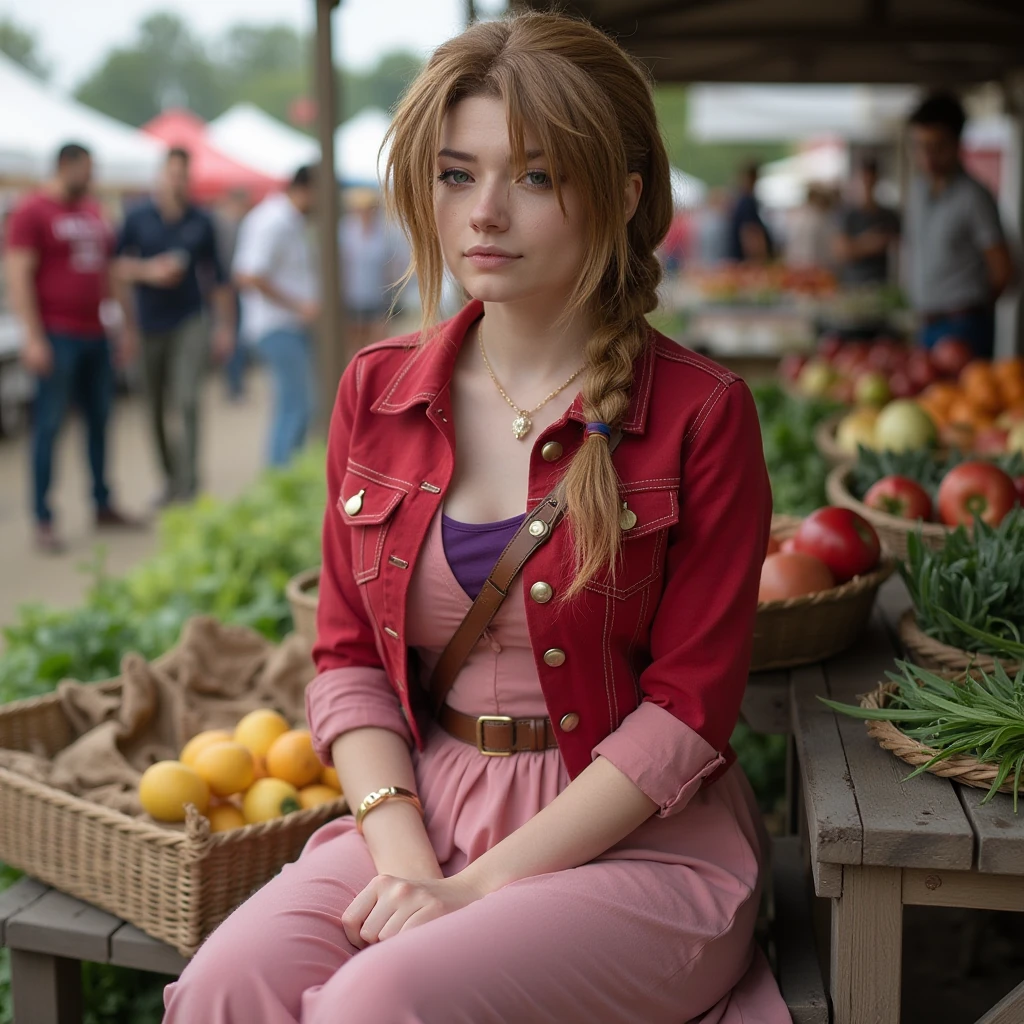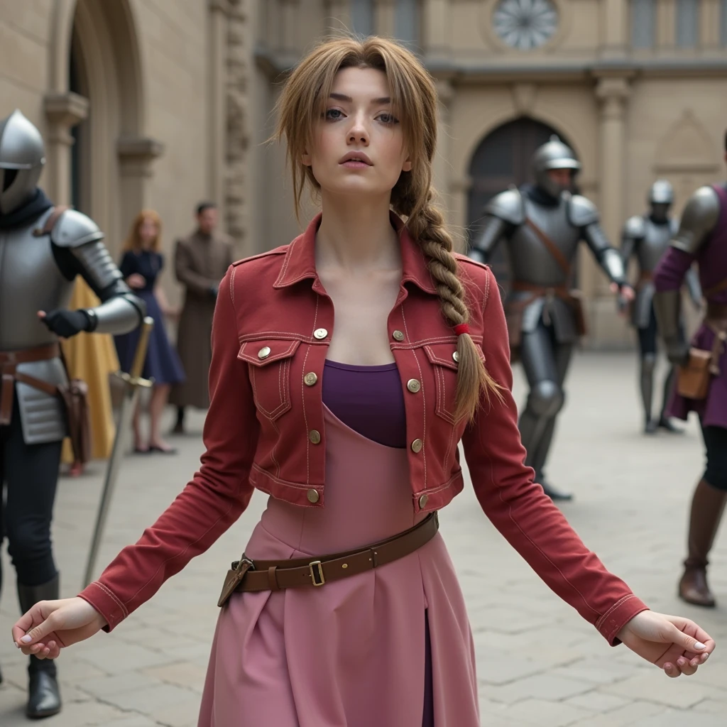 Aerith - {Aerith_\(Final Fantasy\) cosplay, light brown hair, sidelocks, single long braid, cropped red denim jacket, long pink dress, violet undershirt}