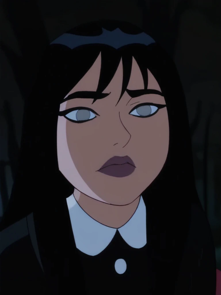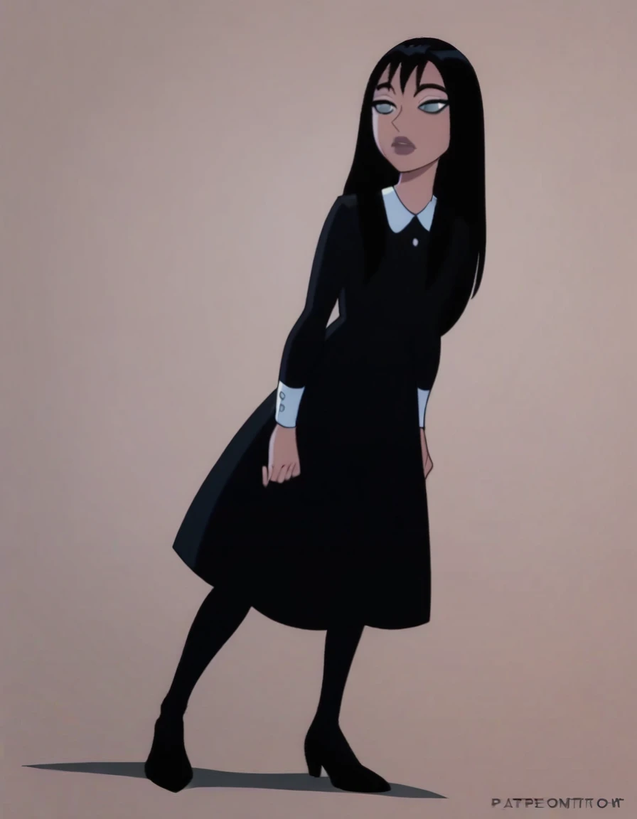 natalia knight, long hair, black hair, grey eyes, lips, black dress, long sleeves, black shoes,
