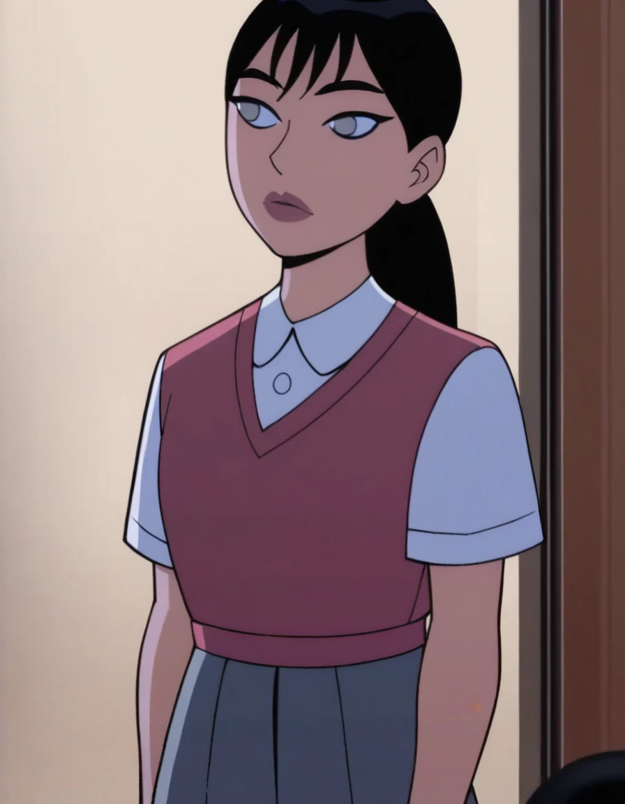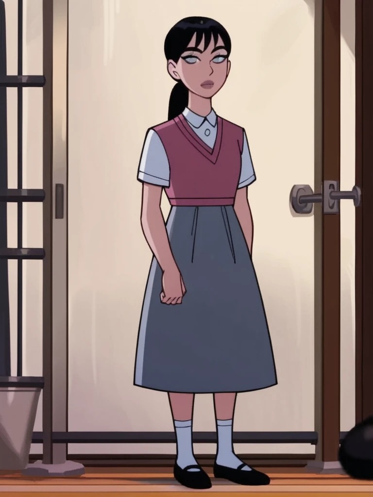 ponytail, black hair, short sleeves, white shirt, sweater vest, gray skirt, white socks, black shoes,