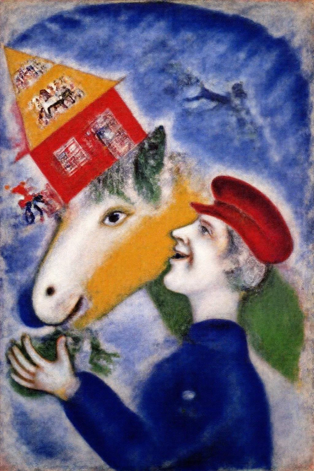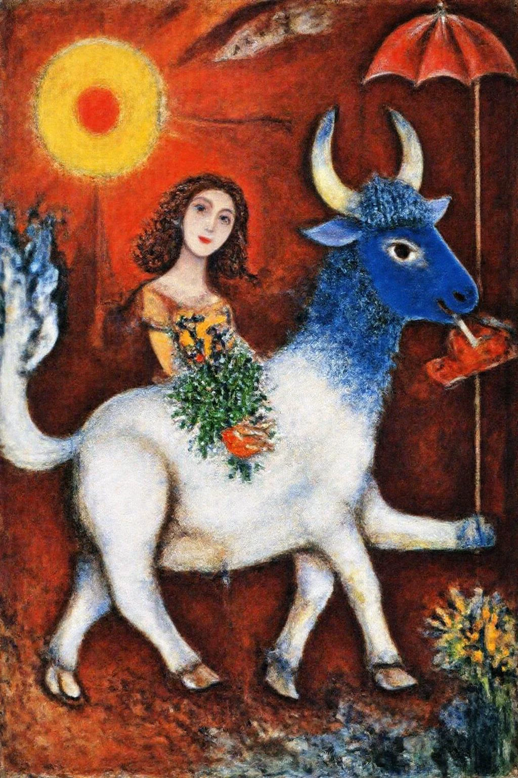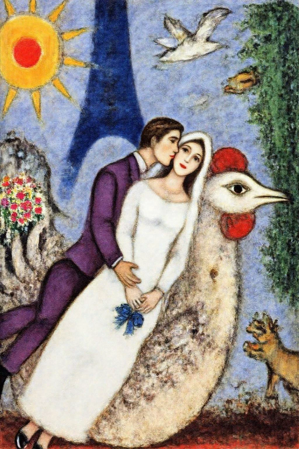 Symbolism: Recurring motifs include lovers, animals (like roosters and cows), musicians, and scenes of village life, reflecting his Jewish upbringing and personal experiences.