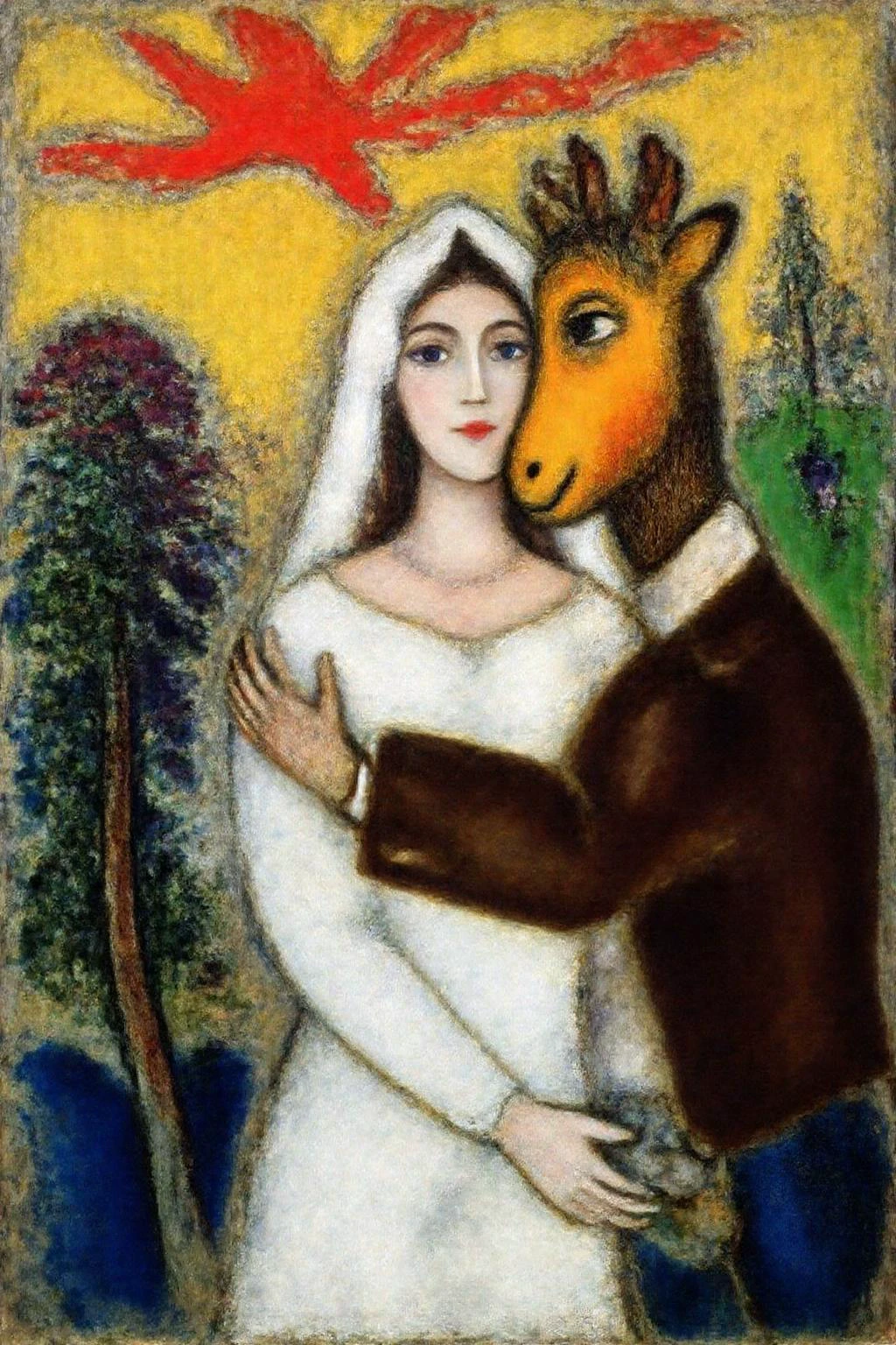 A whimsical, romantic painting portraying Chagall and his wife Bella Levina Rosenfeld, symbolizing their profound love.