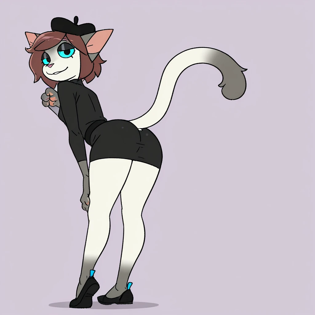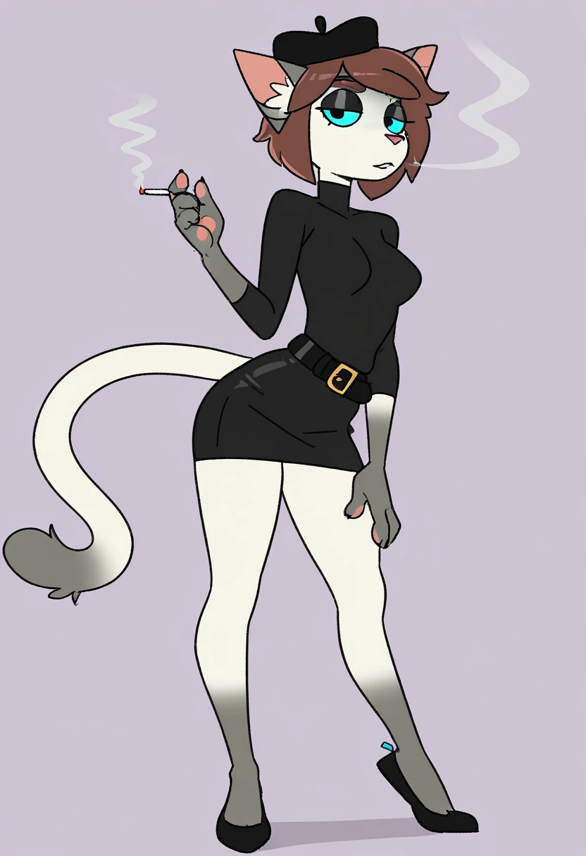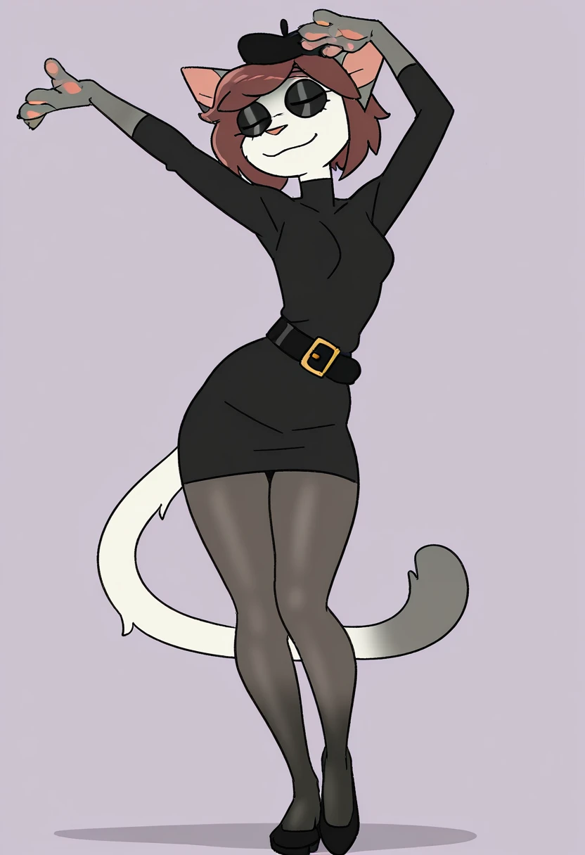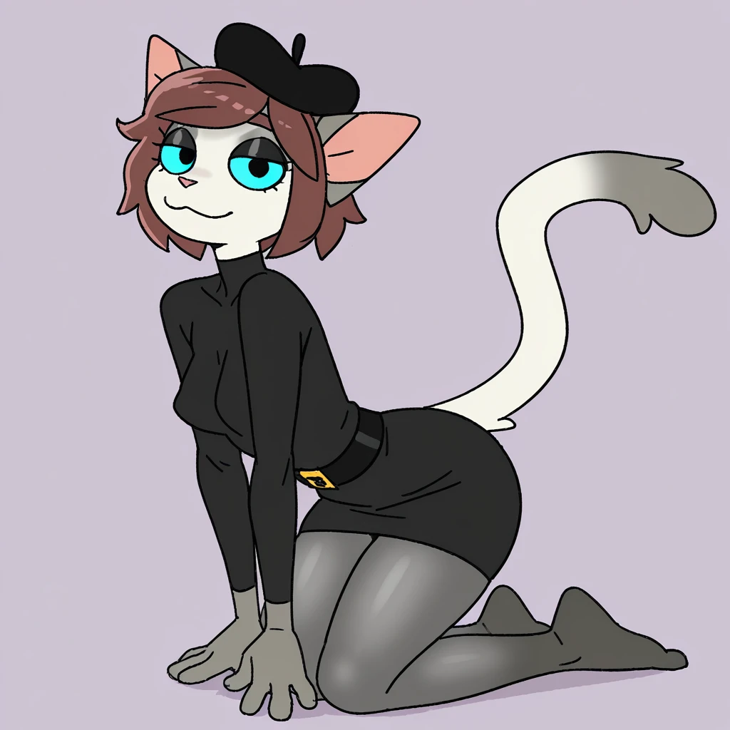 cat, 1girl, female, brown hair, black headwear, belt, colored sclera