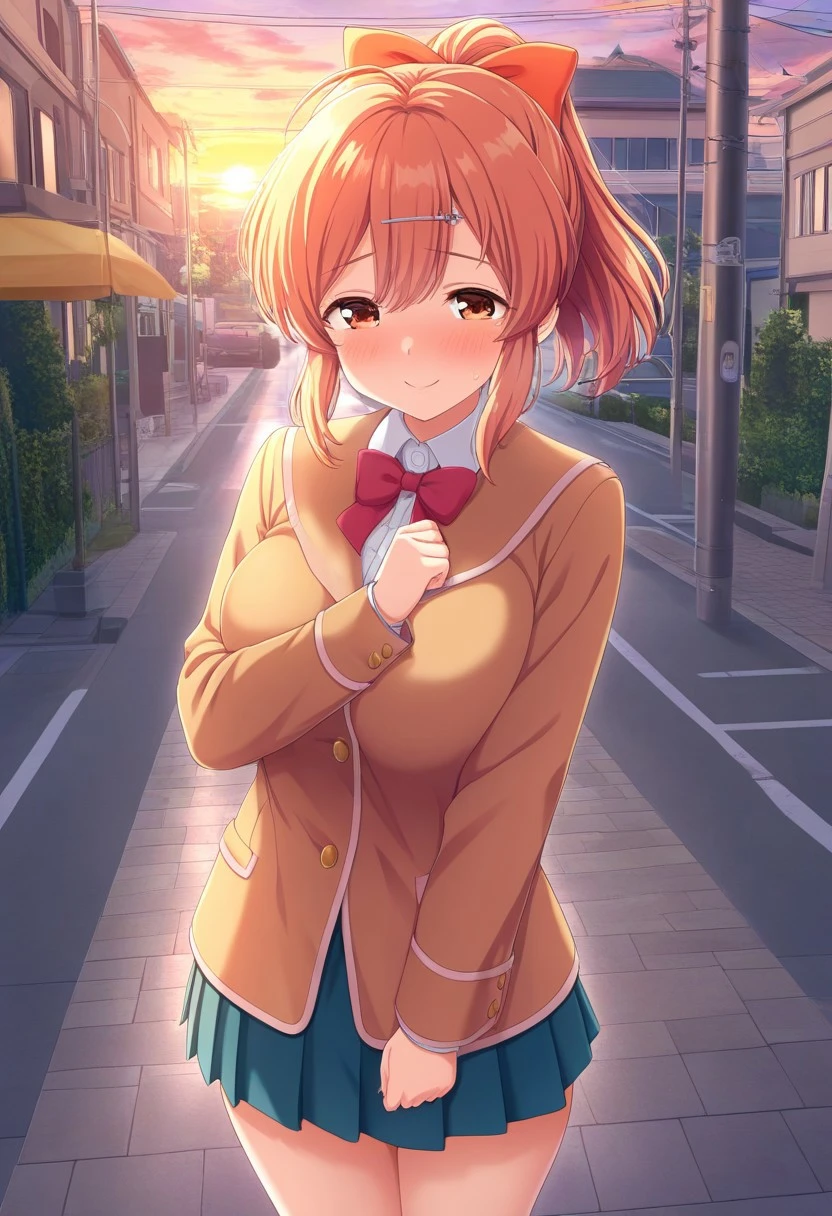 sakurai_akane, 1girl, orange_hair, hairpin, hair_bow, ponytail, medium_breast,