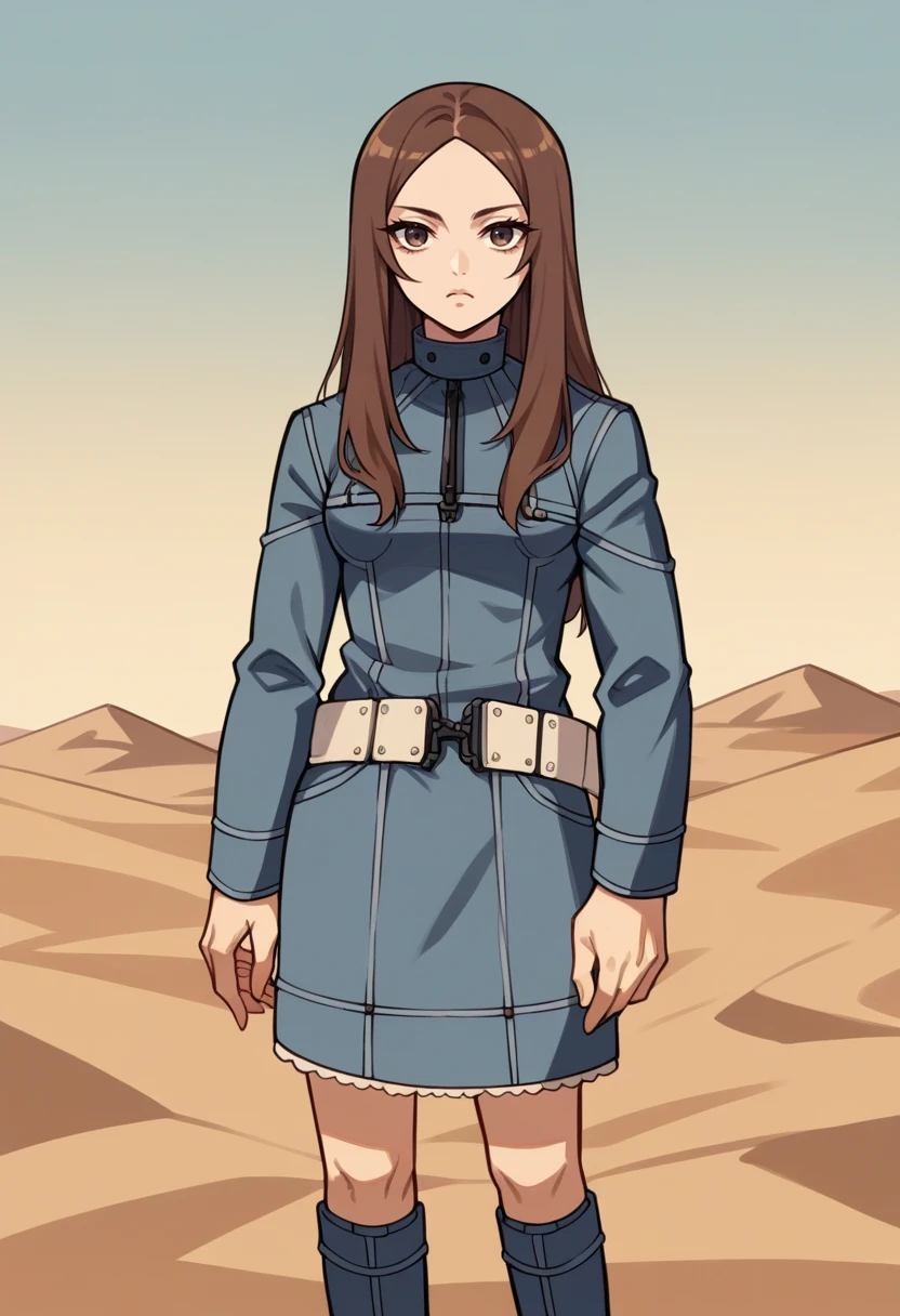 chiakismtiii, long hair, brown hair, dress, long sleeves, belt, knee boots