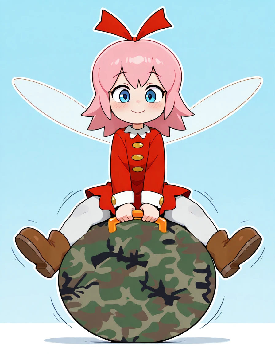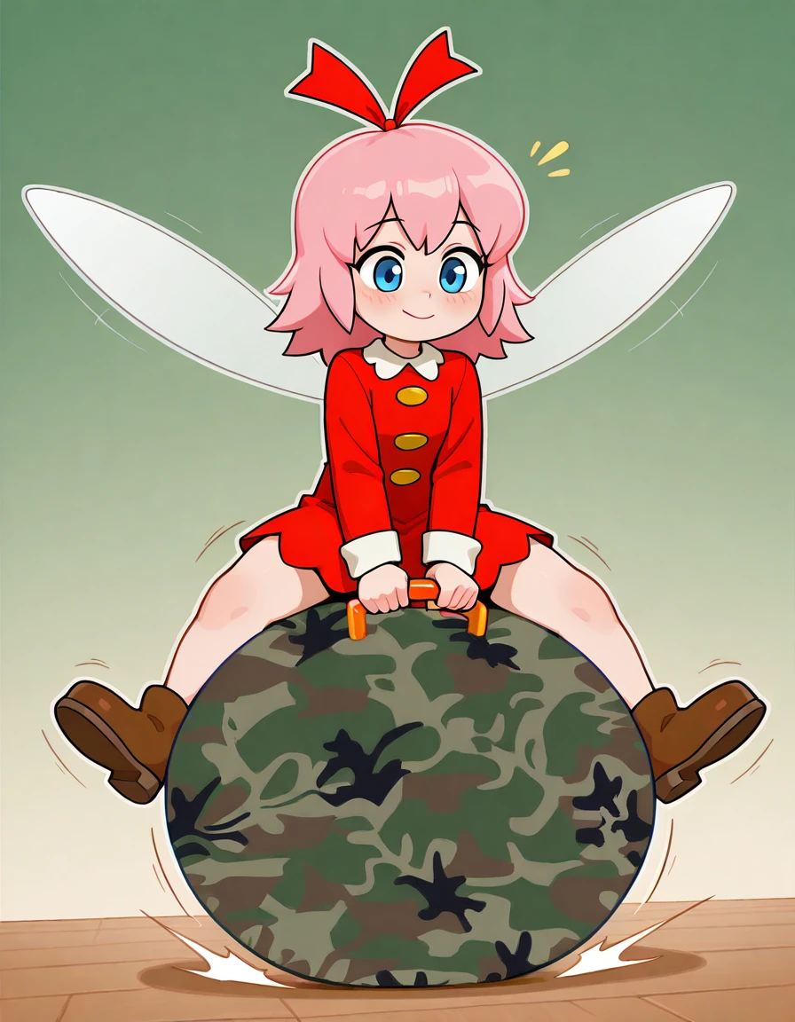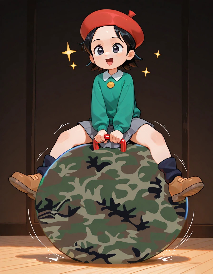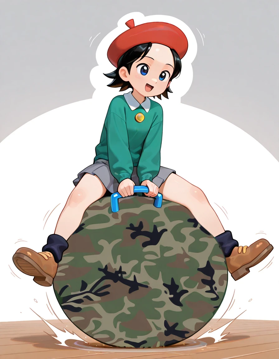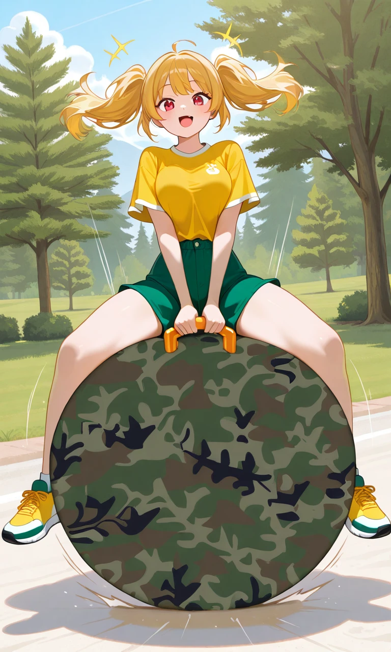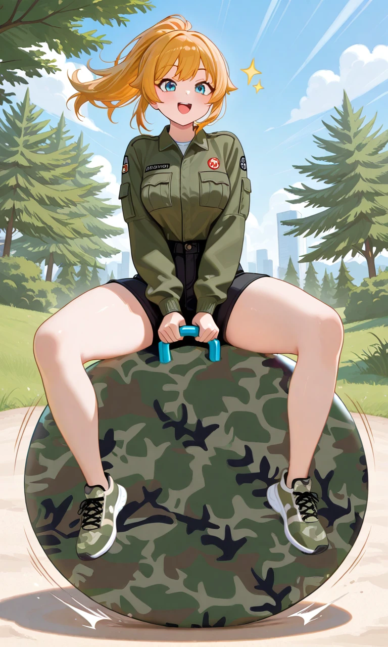 big hopper ball, big bouncy ball, ride big hopper ball, big inflatable ball, hopper ball handle, grabbing hopper ball handle, handle between legs, sitting on big hopper ball, wide handle, , printed ball design, camouflage print