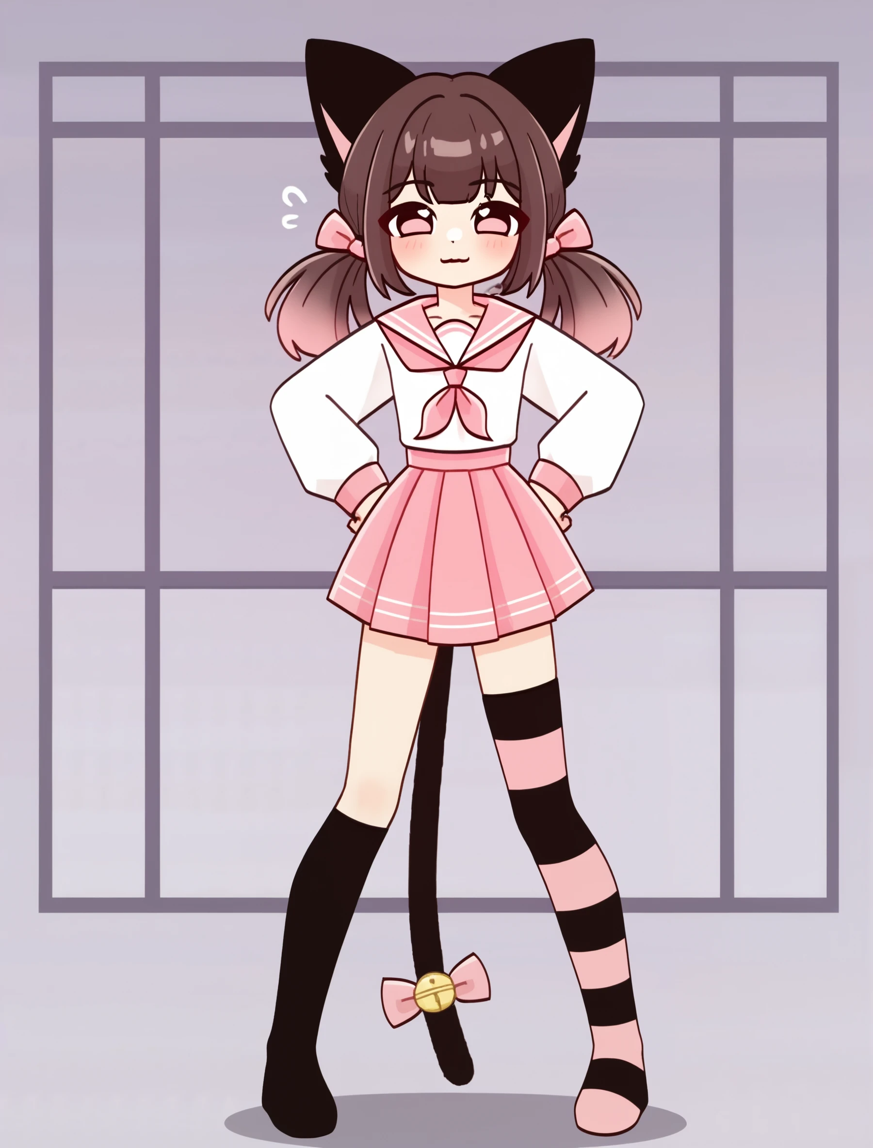 To get Meobah's character you can use these trigger words: meowbah, school uniform, pink neckerchief, pink eyes, pink bows, cat ears, cat tail, thighhighs, asymmetrical legwear, striped socks, pleated skirt, pink skirt, white shirt, twintails, pink bows