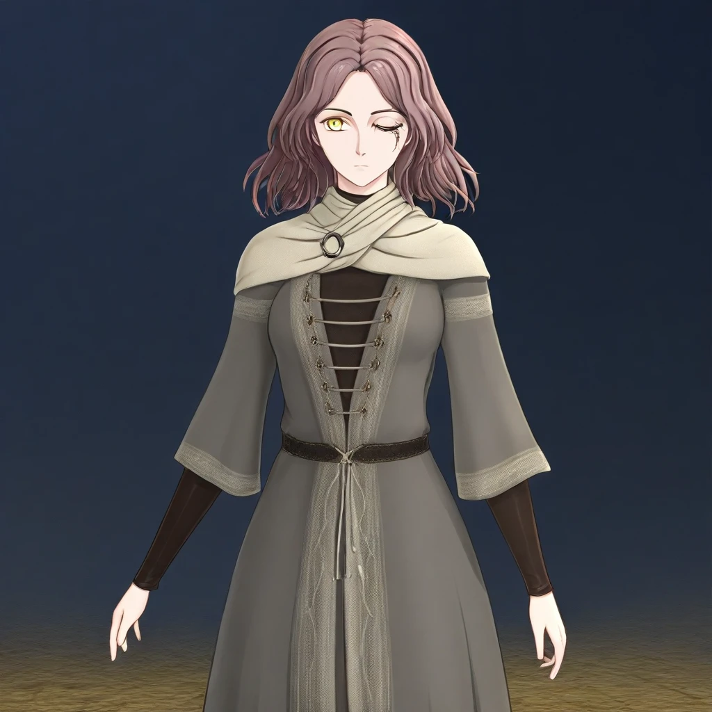 Melina_ER, lefteyemark, yellow eyes, brown hair, one eye closed