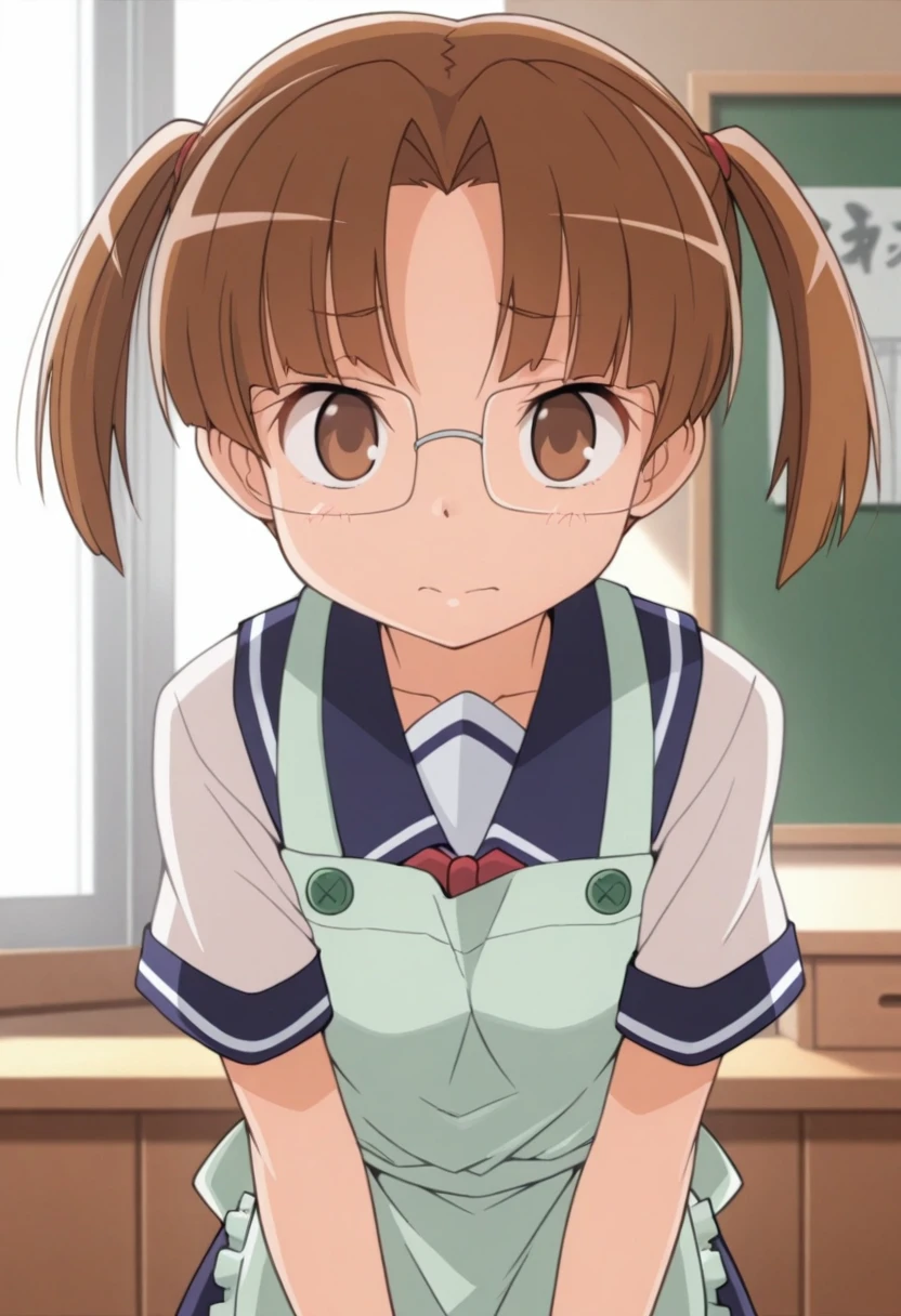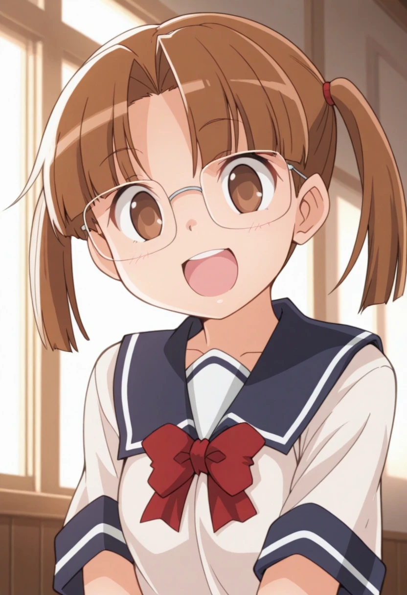 Trigger Words: shinmon yayoi, brown hair, brown eyes, twintails, glasses