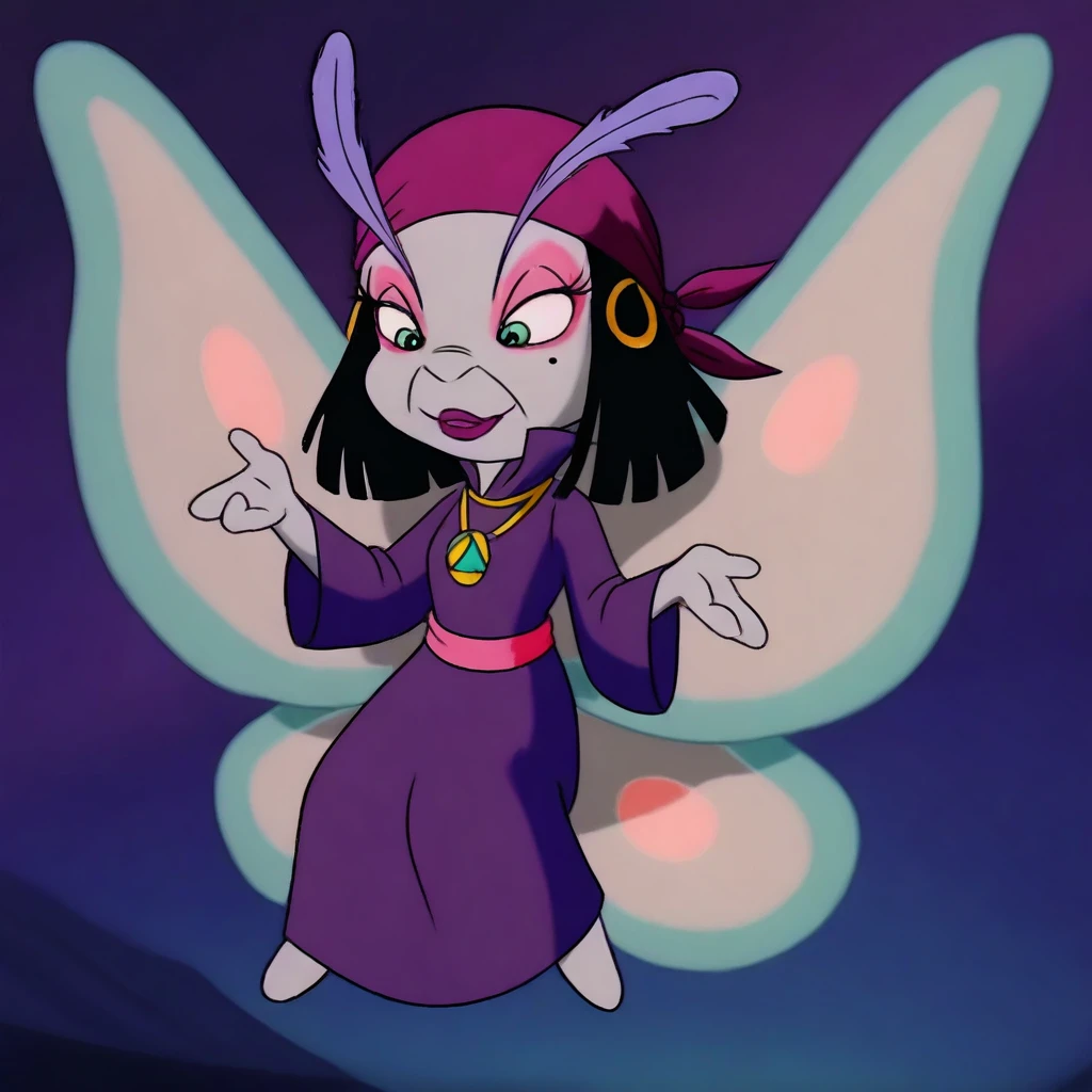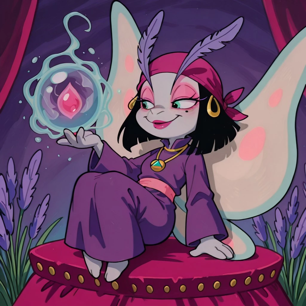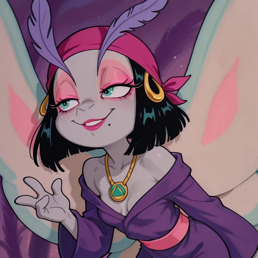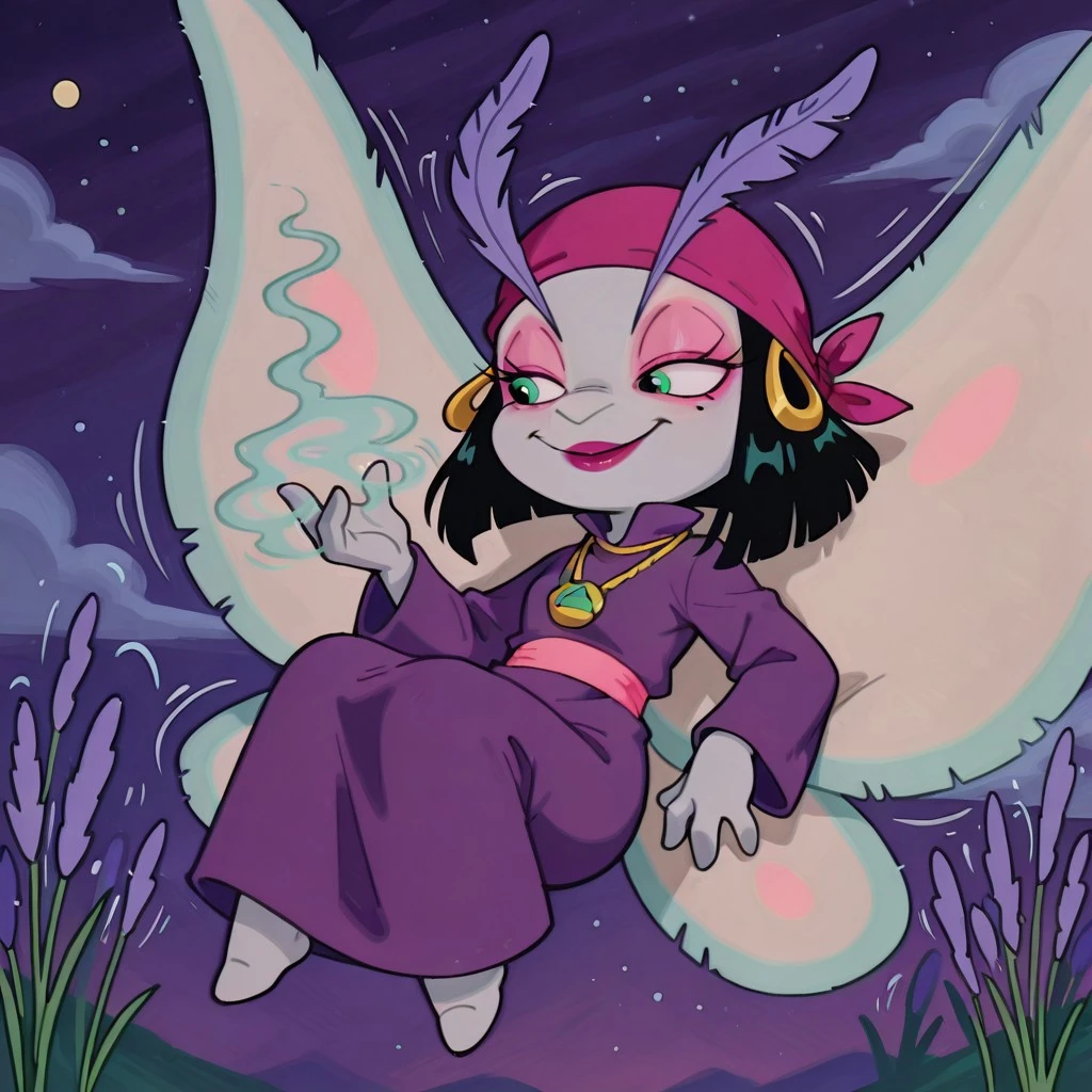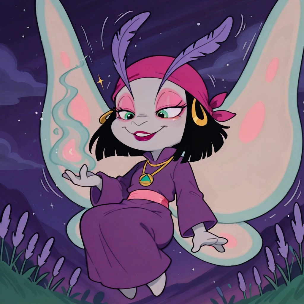 moth female, solo, light gray skin, light green eyes, black bob hair, black hair with blunt ends, dark pink bandana with gold hoops, large lavender feathered eyelashes, large lavender antennae eyelashes, pink eyeshadow, dark pink lipstick, one mole under one eye, pink belt, straight purple robe, plain purple dress, gold necklace with amulet, light blue moth wings with light pink accents,
