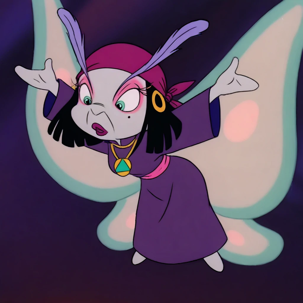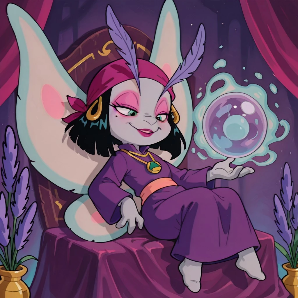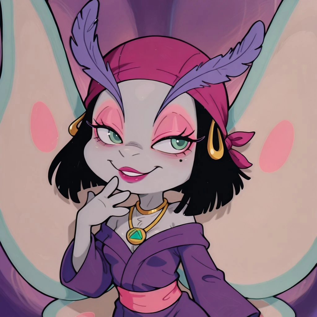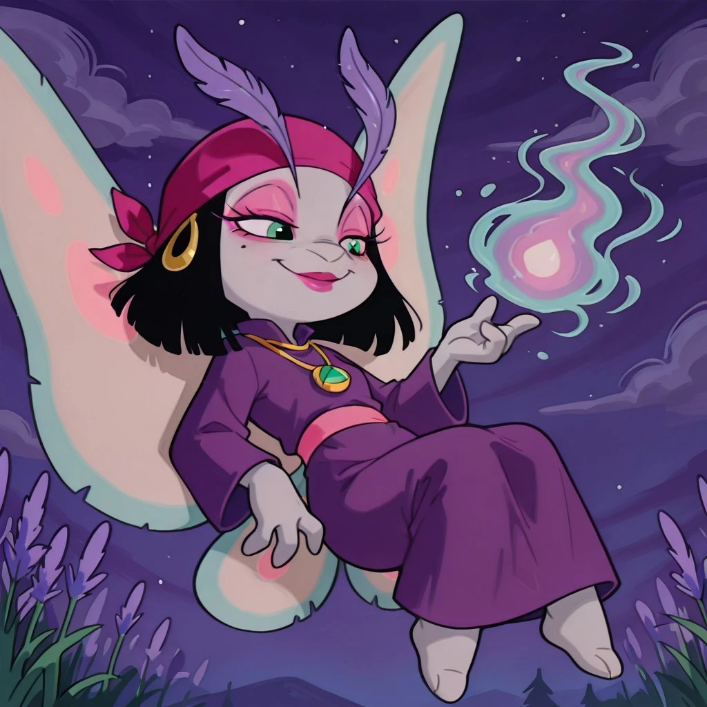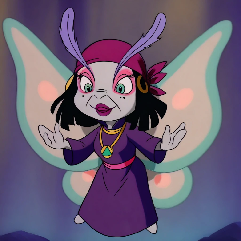 moth female, solo, light gray skin, light green eyes, black bob hair, black hair with blunt ends, dark pink bandana with gold hoops, large lavender feathered eyelashes, large lavender antennae eyelashes, pink eyeshadow, dark pink lipstick, one mole under one eye, pink belt, straight purple robe, plain purple dress, gold necklace with amulet, light blue moth wings with light pink accents,
