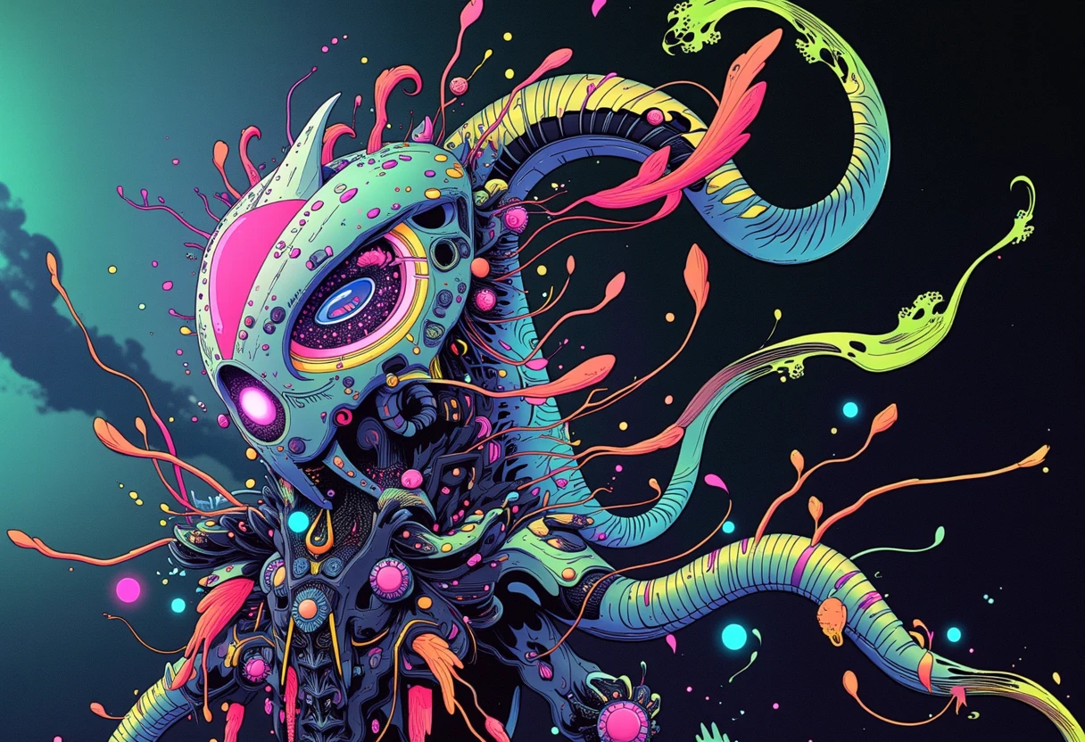A vivid, surreal mecha creature with colorful flora and mushrooms with whimsical shapes emerges, blending nature, metallic like monster, 3D imagination in harmonious chaos.