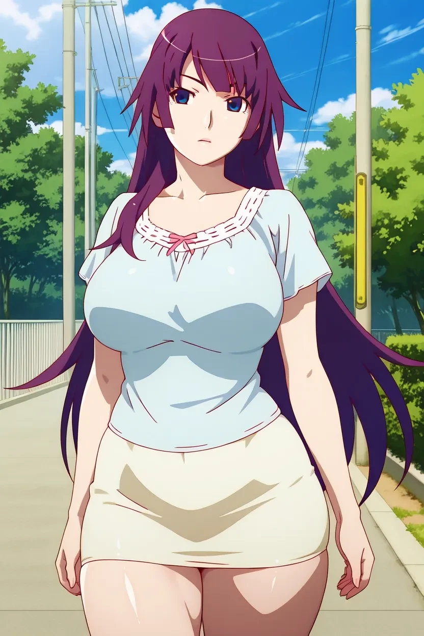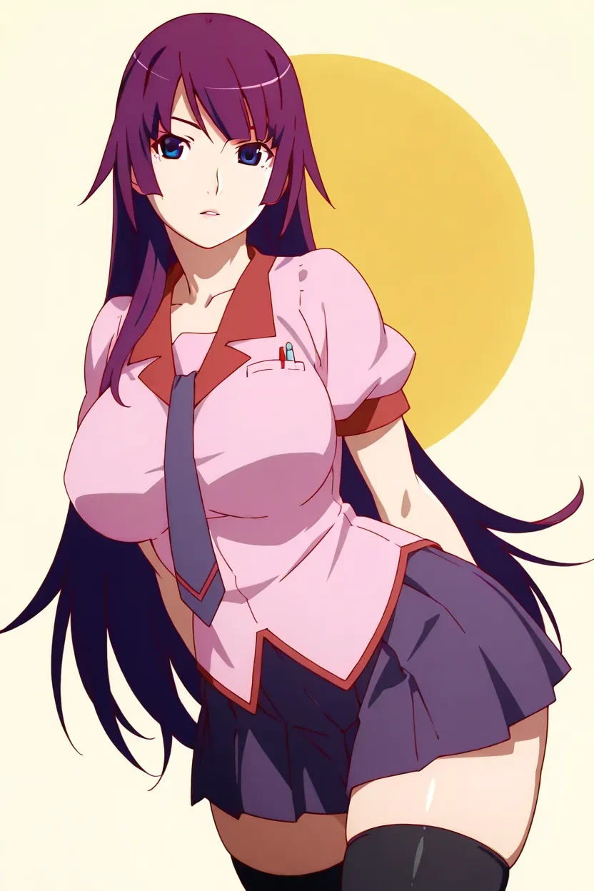 1girl, Hitagi Senjougahara, purple_hair, blue_eyes, long_hair, lips, glossy lips, massive breasts,, Monogatari_art_style, excellent quality, Hi-res, No-Flaws