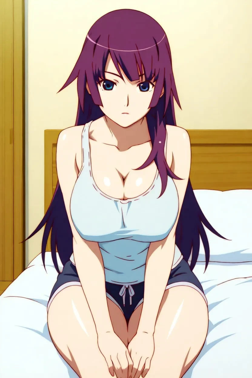1girl, Hitagi Senjougahara, purple_hair, blue_eyes, long_hair, lips, glossy lips, massive breasts, curvy, extremely sexy, wide hips, thick thighs, tank top, shorts,