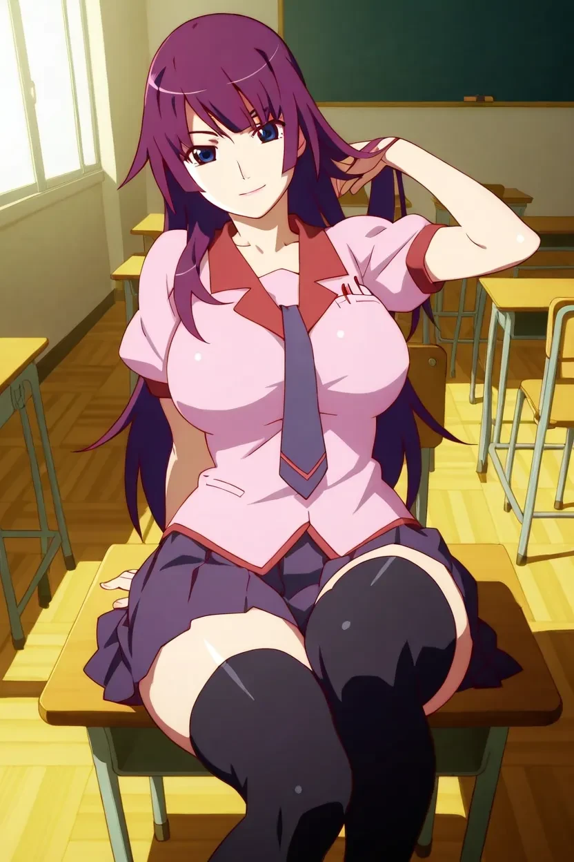1girl, Hitagi Senjougahara, purple_hair, blue_eyes, long_hair, lips, glossy lips, massive breasts, curvy, extremely sexy, wide hips, thick thighs, school uniform, shirt, necktie, skirt, thigh highs