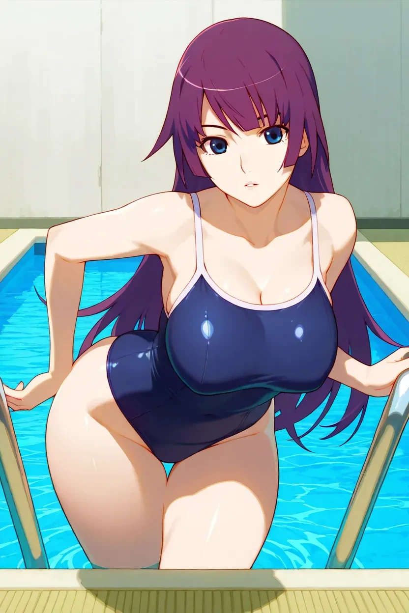 1girl, Hitagi Senjougahara, purple_hair, blue_eyes, long_hair, lips, glossy lips, massive breasts, curvy, extremely sexy, wide hips, thick thighs, school swim suit