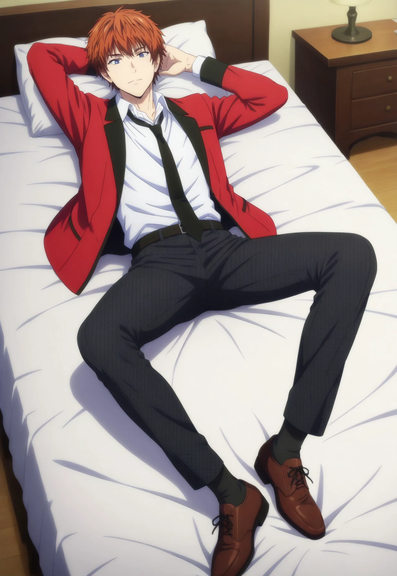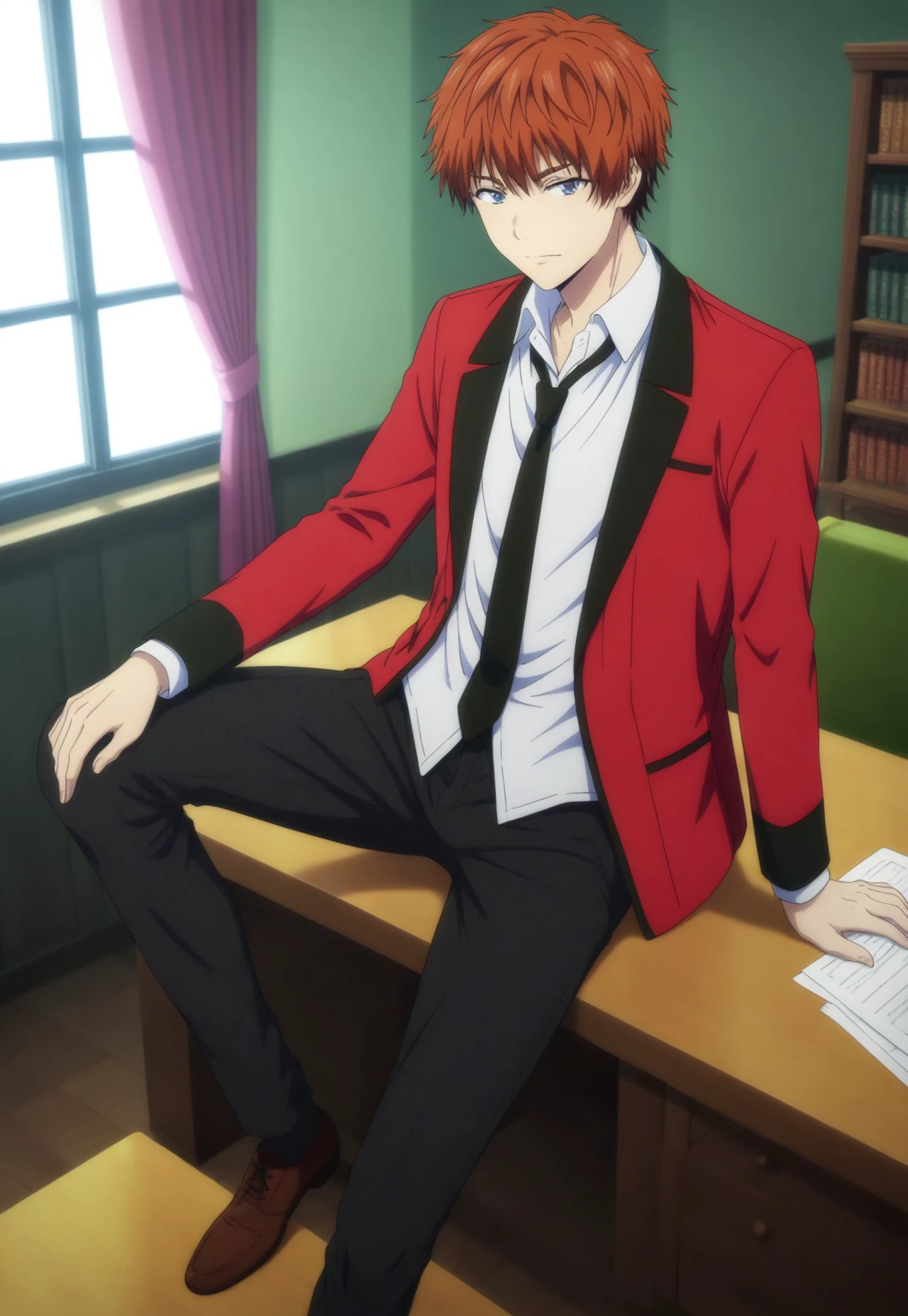 aoi_mibuomi, 1boy, orange hair, short hair, blue eyes, red jacket, collared shirt, white shirt, black necktie, pants, brown shoes