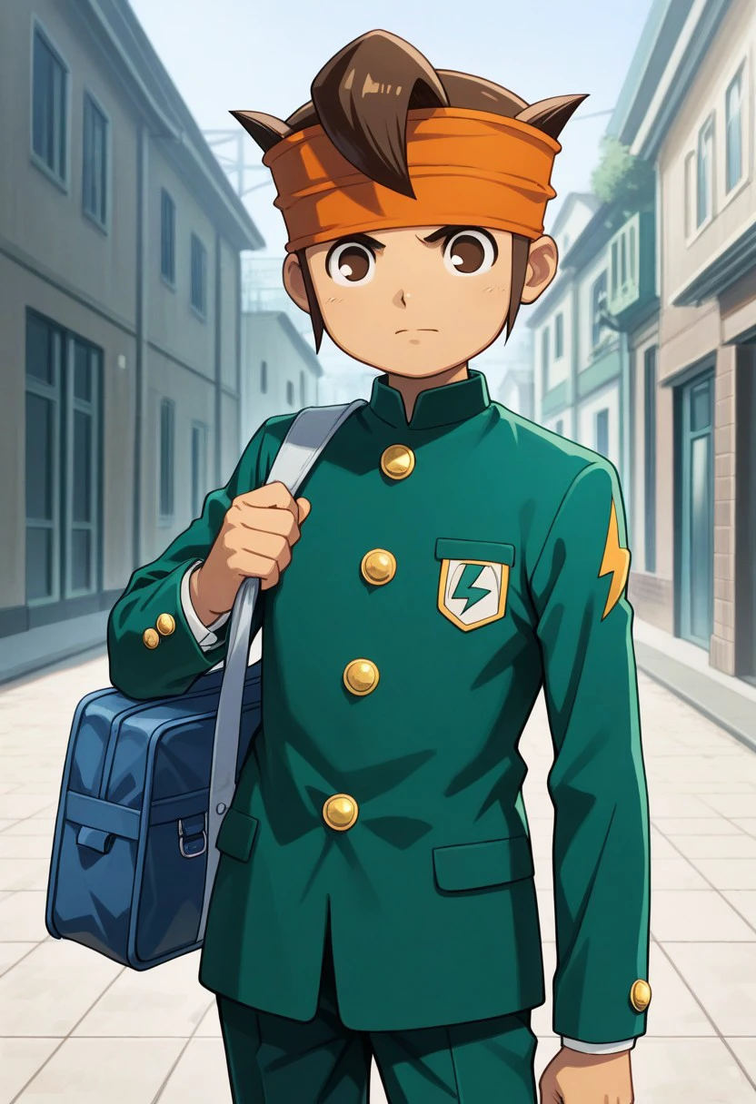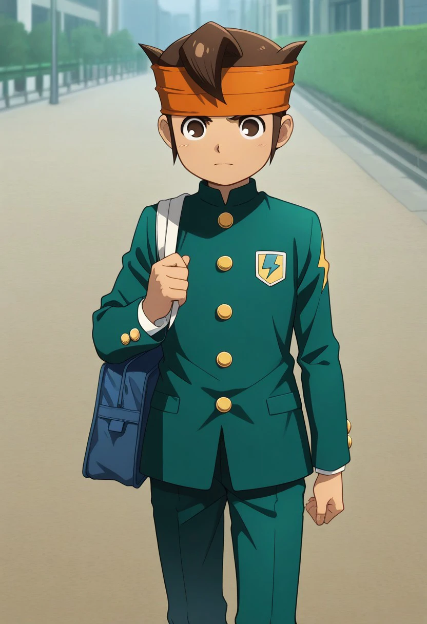 mamoru, 1boy, male focus, solo, brown eyes, brown hair, short hair, headband, raimon, school uniform, gakuran, jacket, green jacket, buttons, long sleeves, buttons, pants, green pants, shoes bag, school bag,