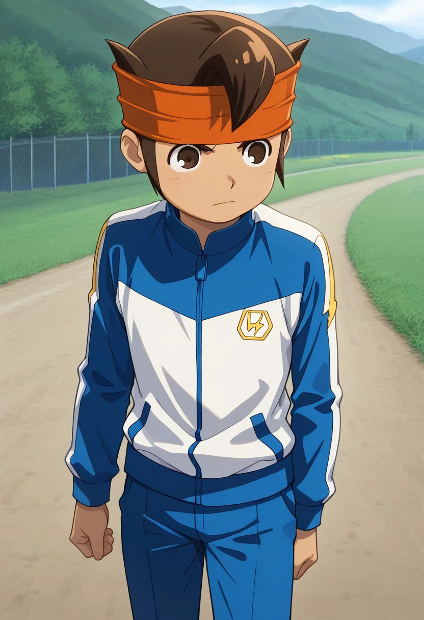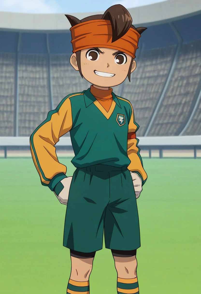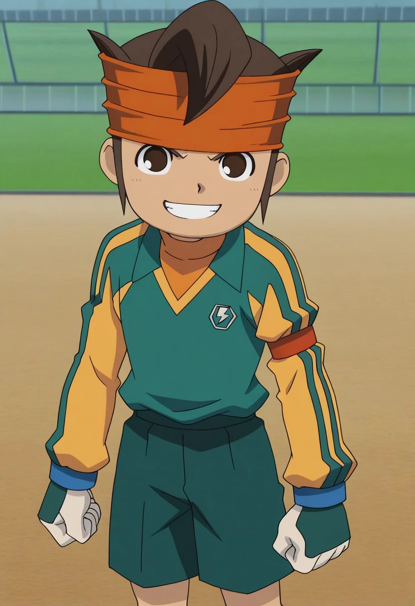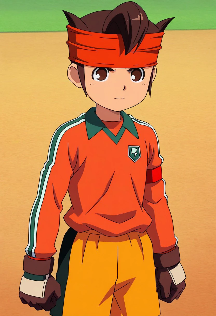 mamoru, 1boy, male focus, solo, brown eyes, brown hair, short hair, headband, sportwear, soccer uniform, raimon soccer uniform, multicolored clothes, multicolored shirt, green shirt, orange shirt, long sleeves, armband, orange shirt, turtleneck, gloves, shorts, green shorts, socks, white socks, shoes, green footwear,