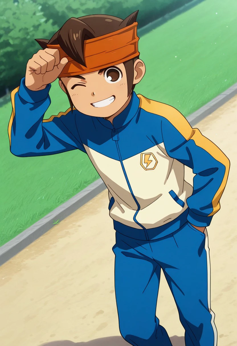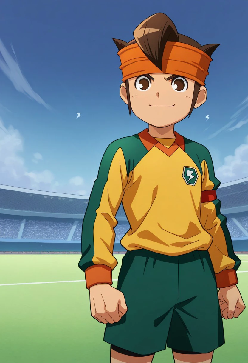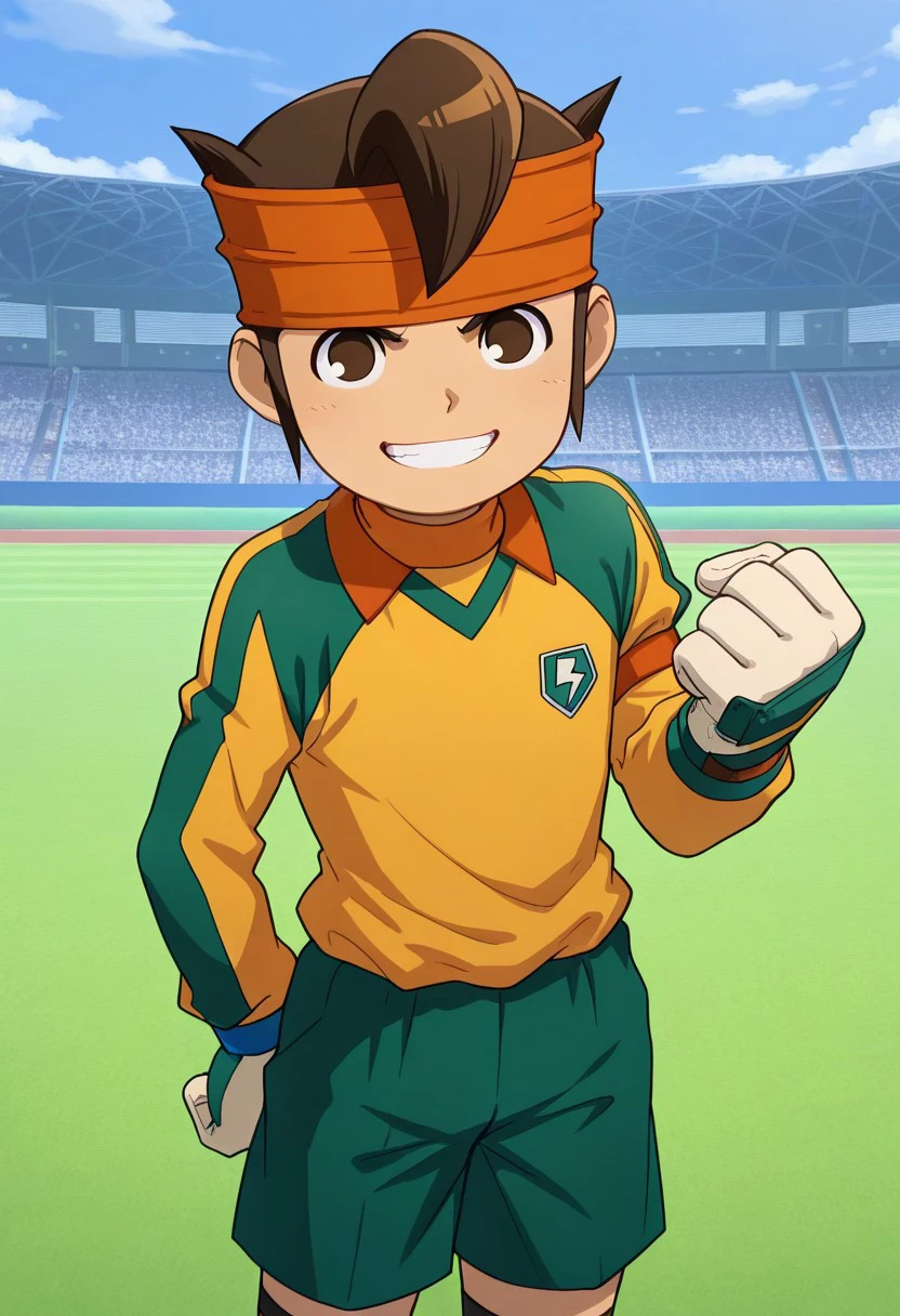 mamoru, 1boy, male focus, solo, brown eyes, brown hair, short hair, headband, sportwear, soccer uniform, inazuma japan soccer uniform, multicolored clothes, shirt, green shirt, yellow shirt, long sleeves, armband, lightning bolt symbol, shorts, green shorts, socks, black socks, shoes, green footwear,