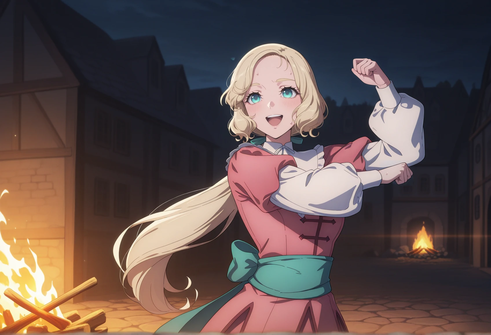Notable tags: absurdly long hair, blonde hair, aqua eyes, low ponytail/hair down, white blouse, pink shirt, green sash