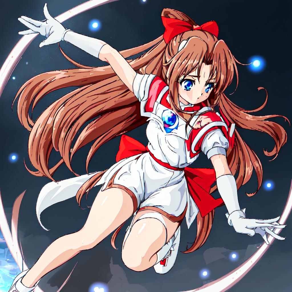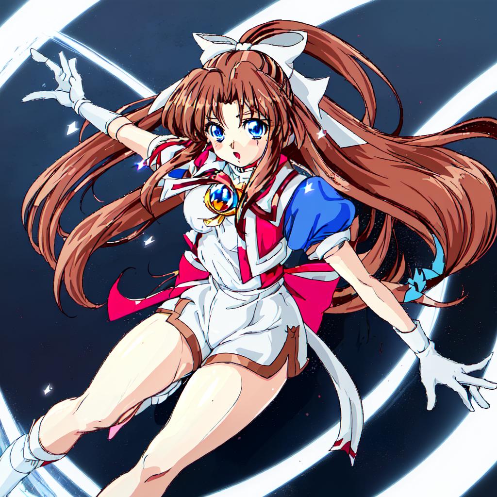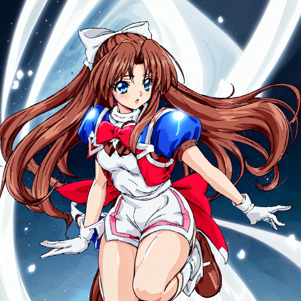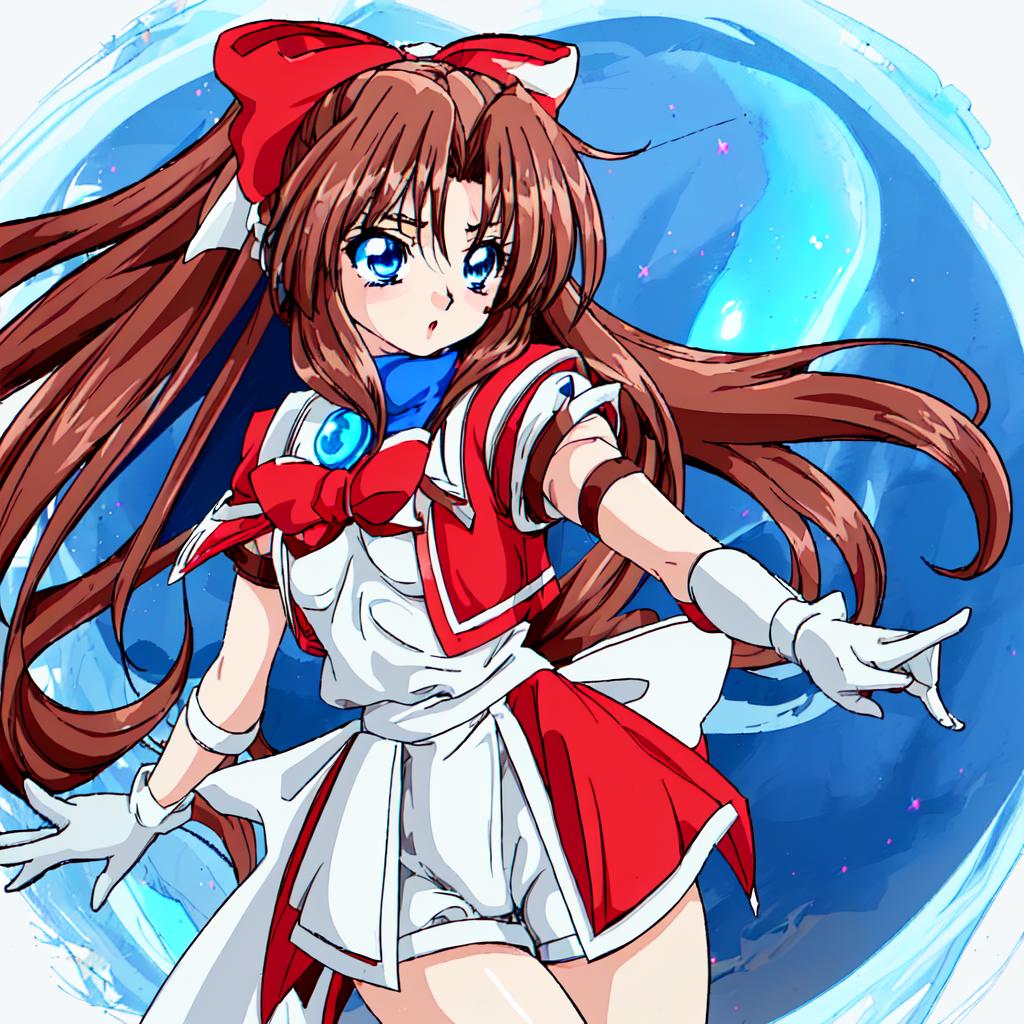 Karin, 1girl, solo, long hair, blue eyes,brown hair, gloves, shorts, white gloves, magical girl,low-tied long hair,white hair bow,red shoulder, white minidress