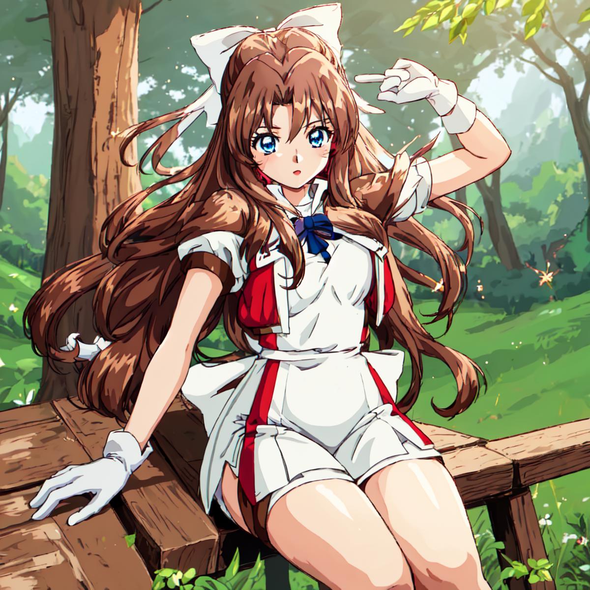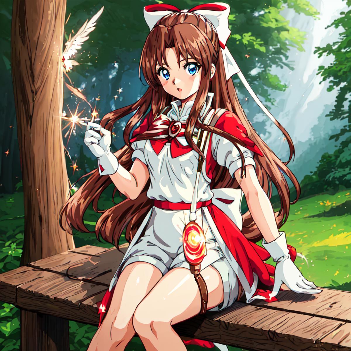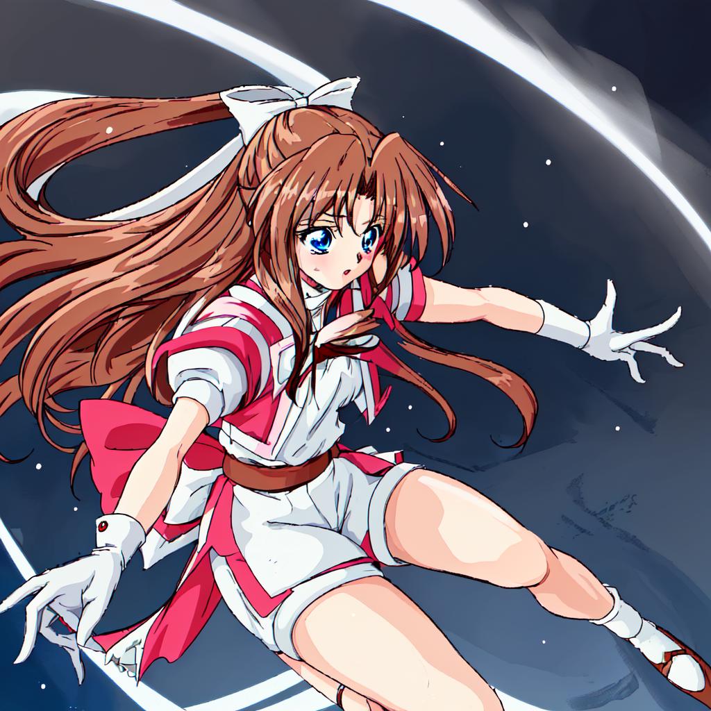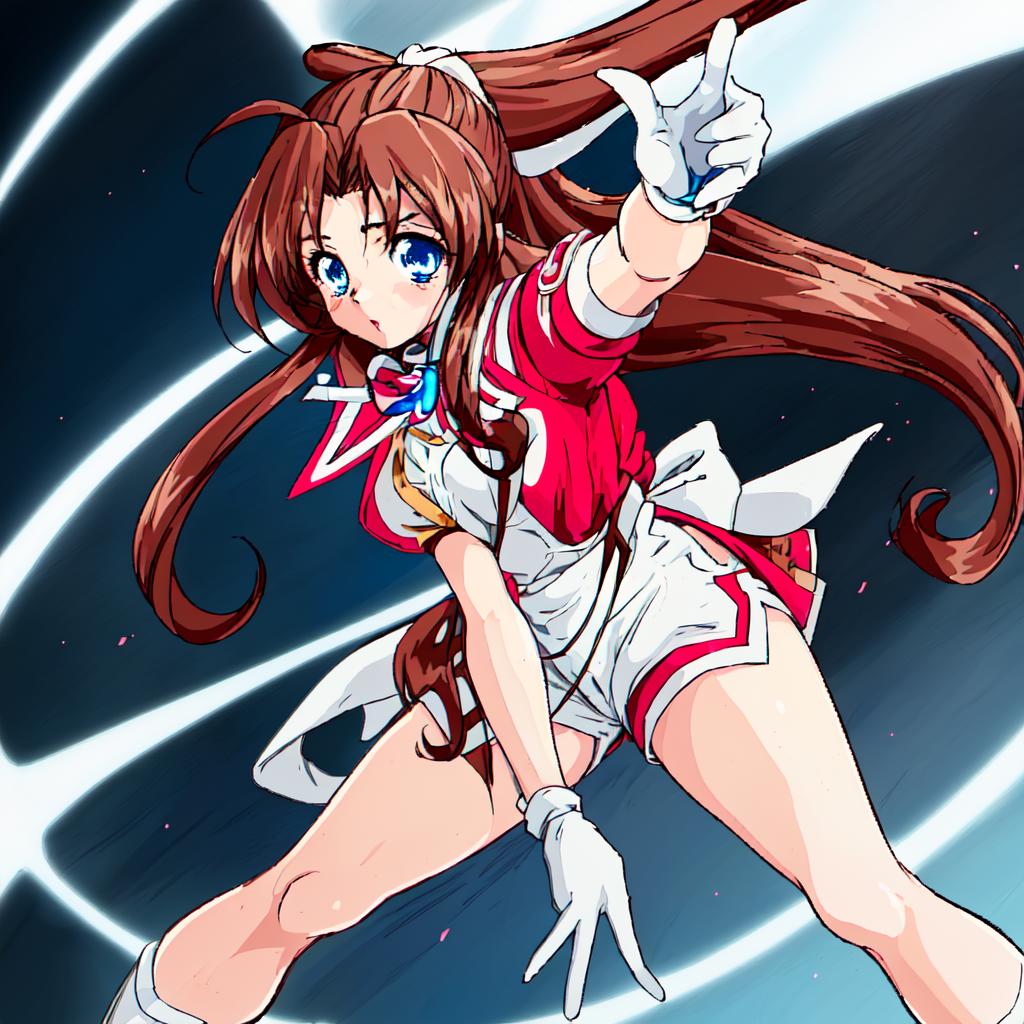 Karin, 1girl, solo, long hair, blue eyes,brown hair, gloves, shorts, white gloves, magical girl,low-tied long hair,white hair bow,red shoulder, white minidress