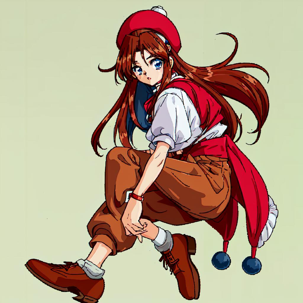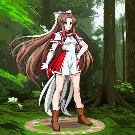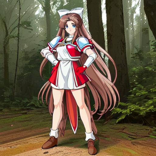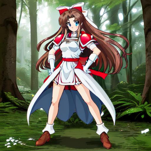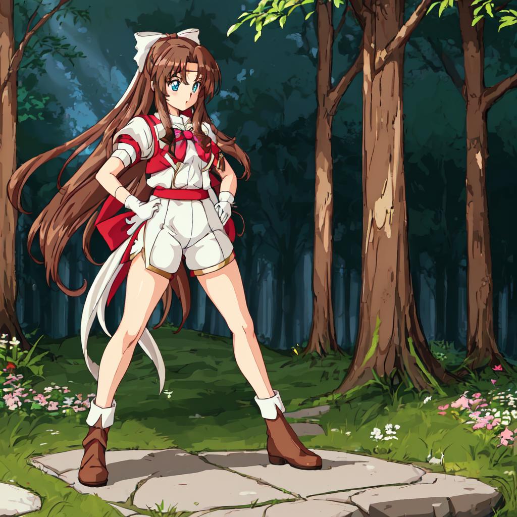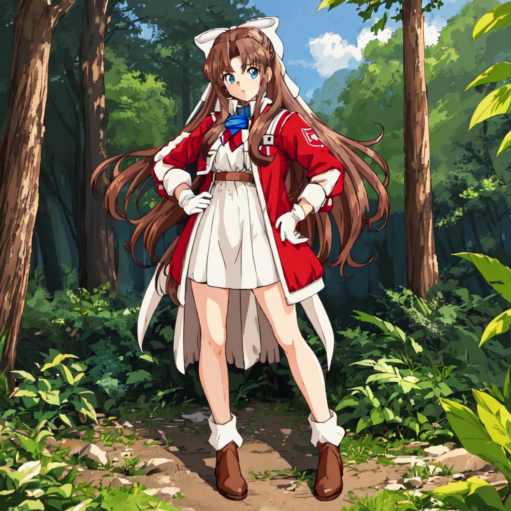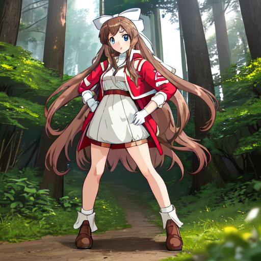 Karin, 1girl, solo, long hair, blue eyes,brown hair, gloves, shorts, white gloves, magical girl,low-tied long hair,white hair bow,red shoulder, white minidress