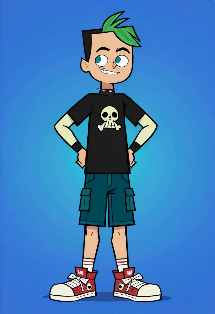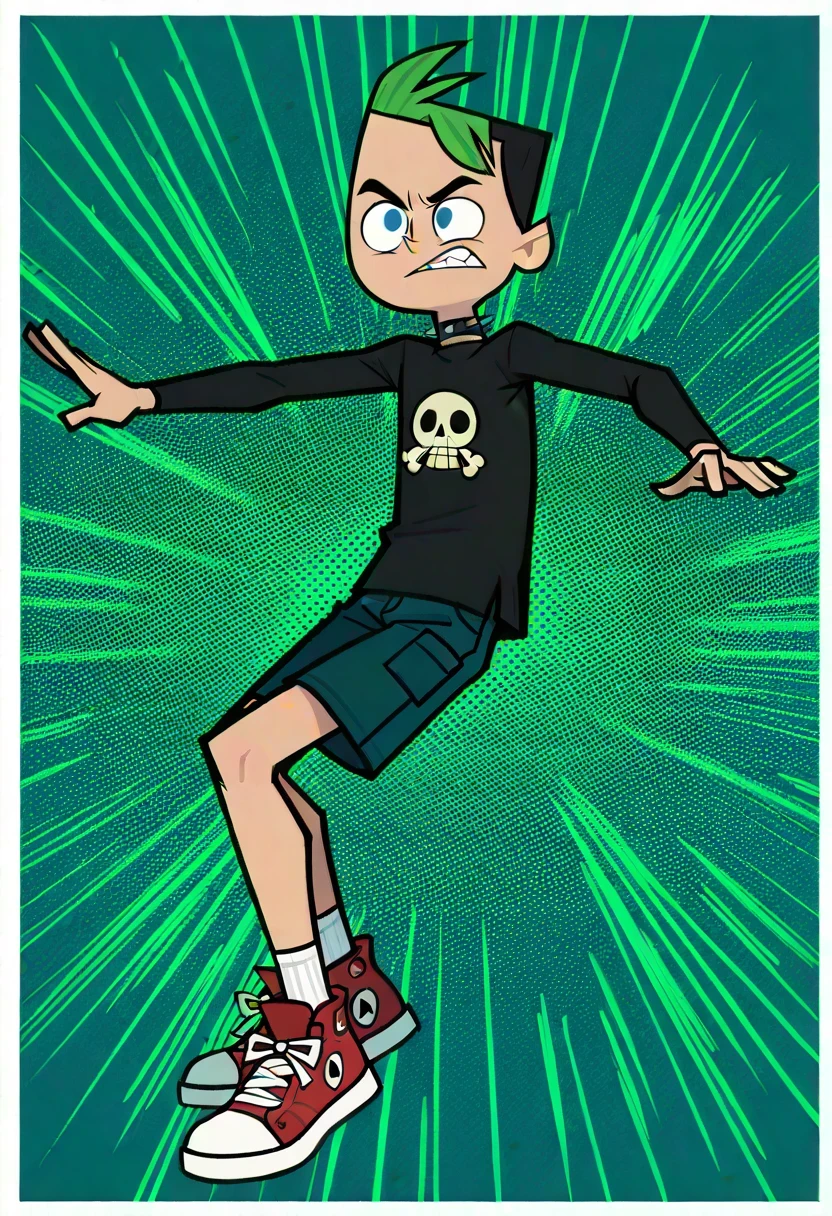 DuncanTDR, 1boy, black and lime green hair, teal eyes, black t-shirt with a skull symbol, long sleeved cream shirt, dark teal shorts, red high-top sneakers,