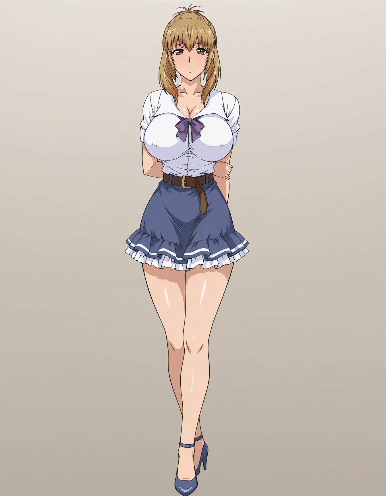 mai_sfst,mai_miraisf,long_hair,blonde_hair,brown_eyes,large_breasts,white_shirt,purple_bow,brown_belt,dark_blue_skirt,frilled_dress,high_heels