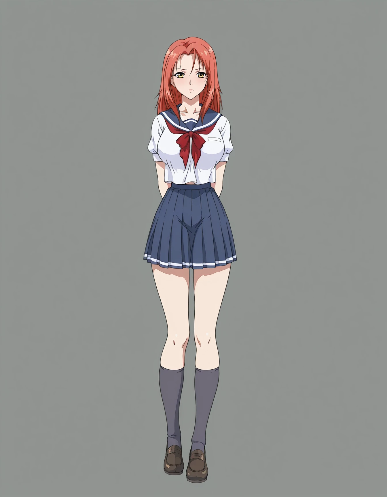 mai_sfst,mai_izumisf,long_hair,red_hair,yellow_eyes,black_dress,short_dress,yellow_jacket,suit_jacket,short_sleeves,pendant,high_heels