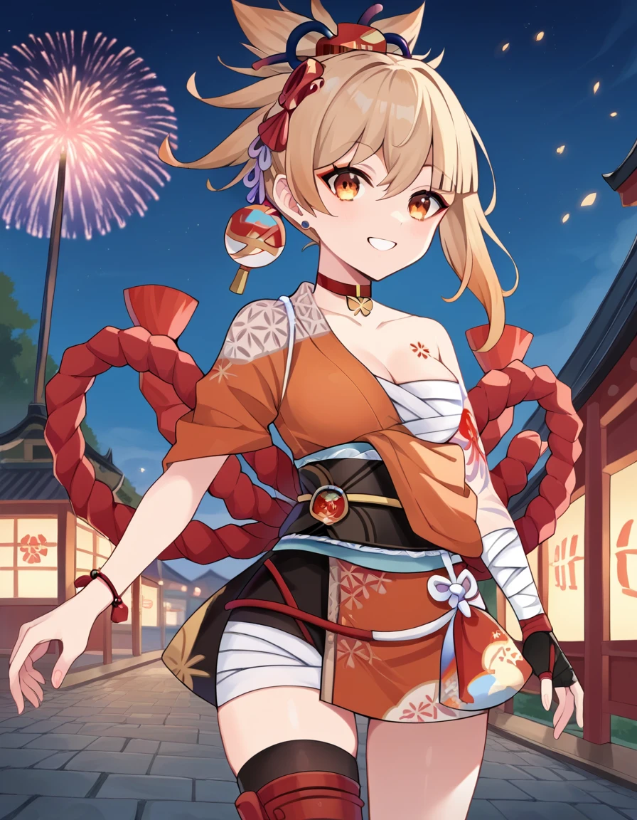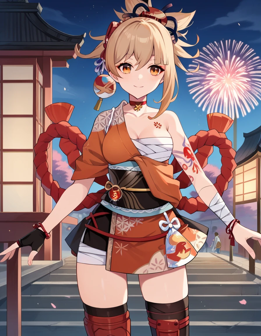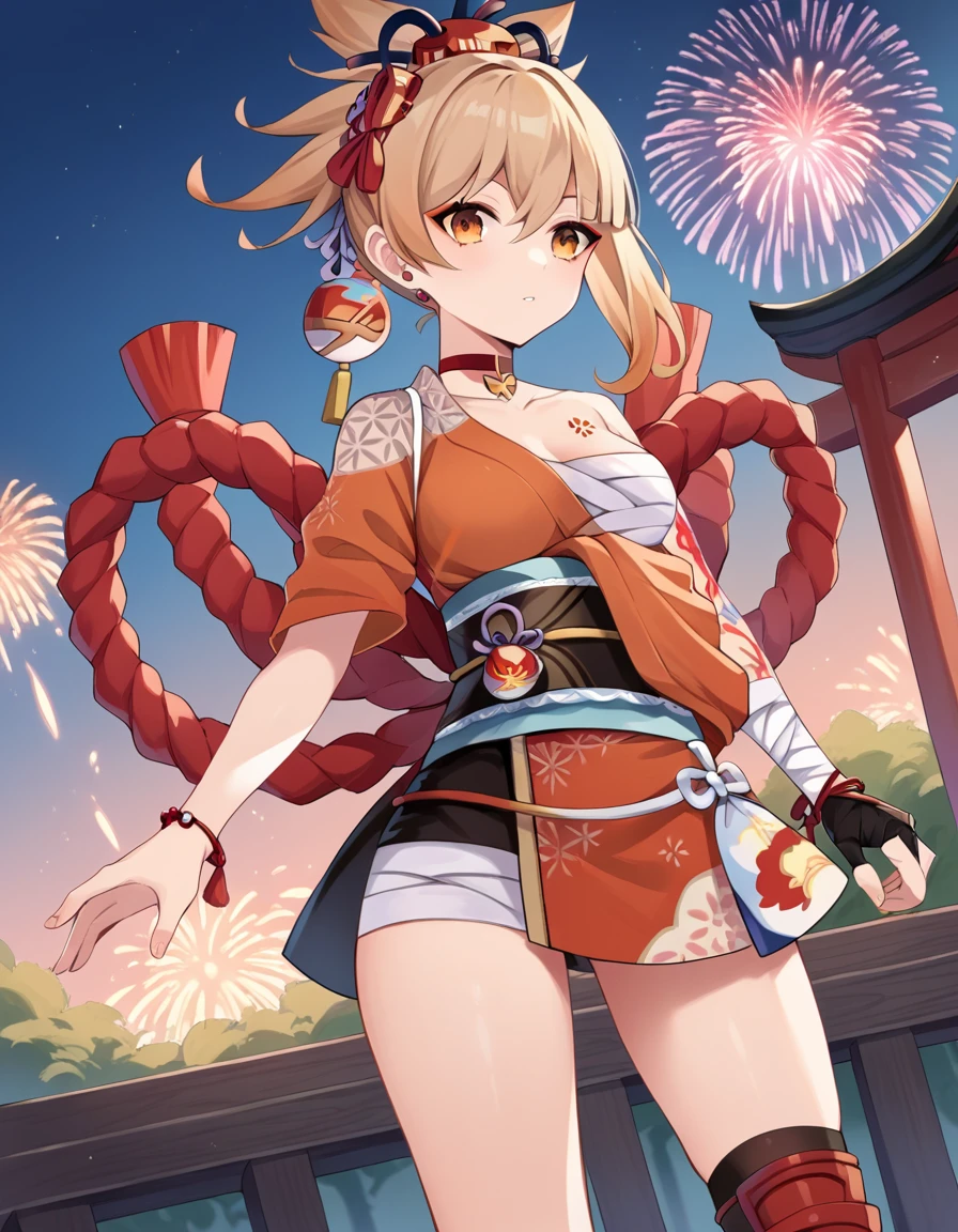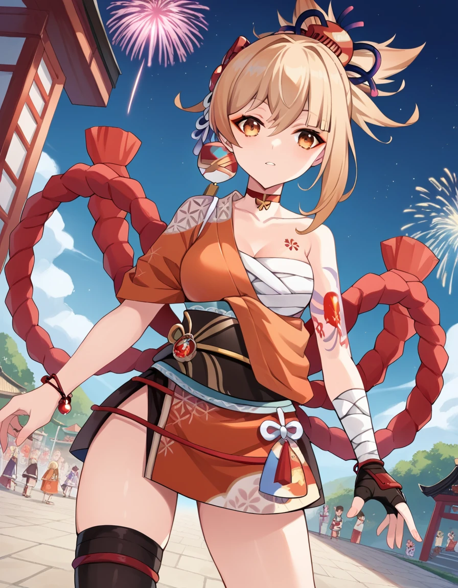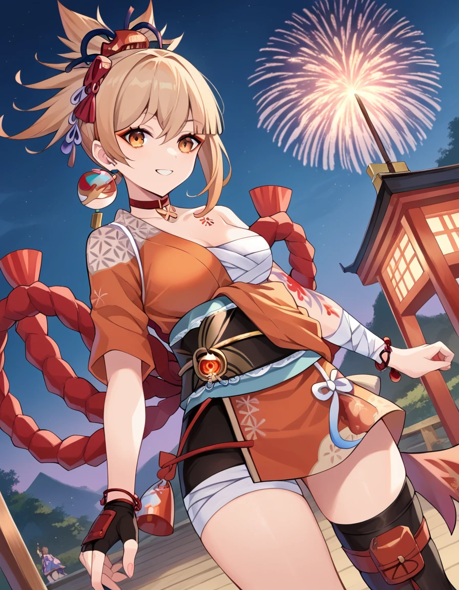 yoimiya, bangs, blonde hair, hair ornament, hair between eyes, ponytail, sidelocks, orange eyes, light brown hair,
