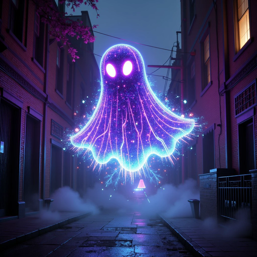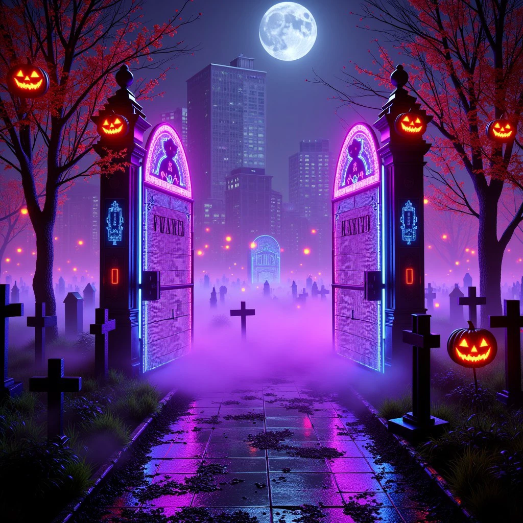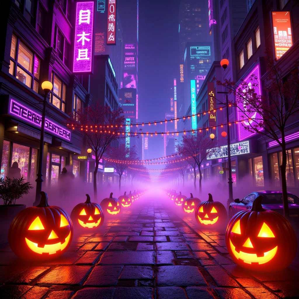 TLDR: This adds cyberpunk Halloween elements like glowing skeletons, digital pumpkins, and futuristic landscapes. It transforms your image into a vibrant, neon-lit, eerie scene.
