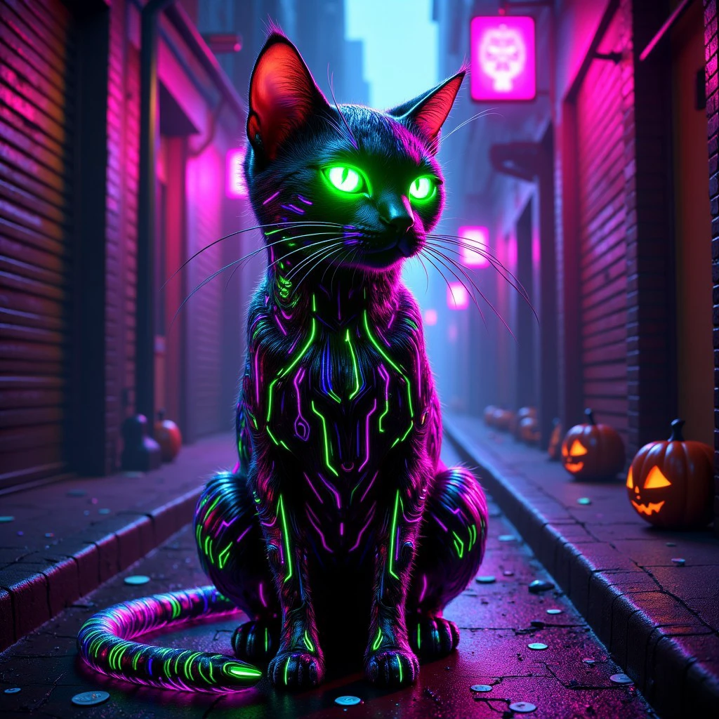 The cyberpunk_halloween LoRA brings a futuristic twist to classic Halloween elements, combining glowing, neon-lit environments with eerie, cybernetic creatures. It infuses your artwork with vibrant colors like electric blues, greens, and purples, creating a spooky yet high-tech atmosphere. Expect to create images featuring spiders, witches, graveyards, mummies, and skeletons, along with other eerie elements like jack-o-lanterns, pumpkins, bats, werewolves, and skulls.