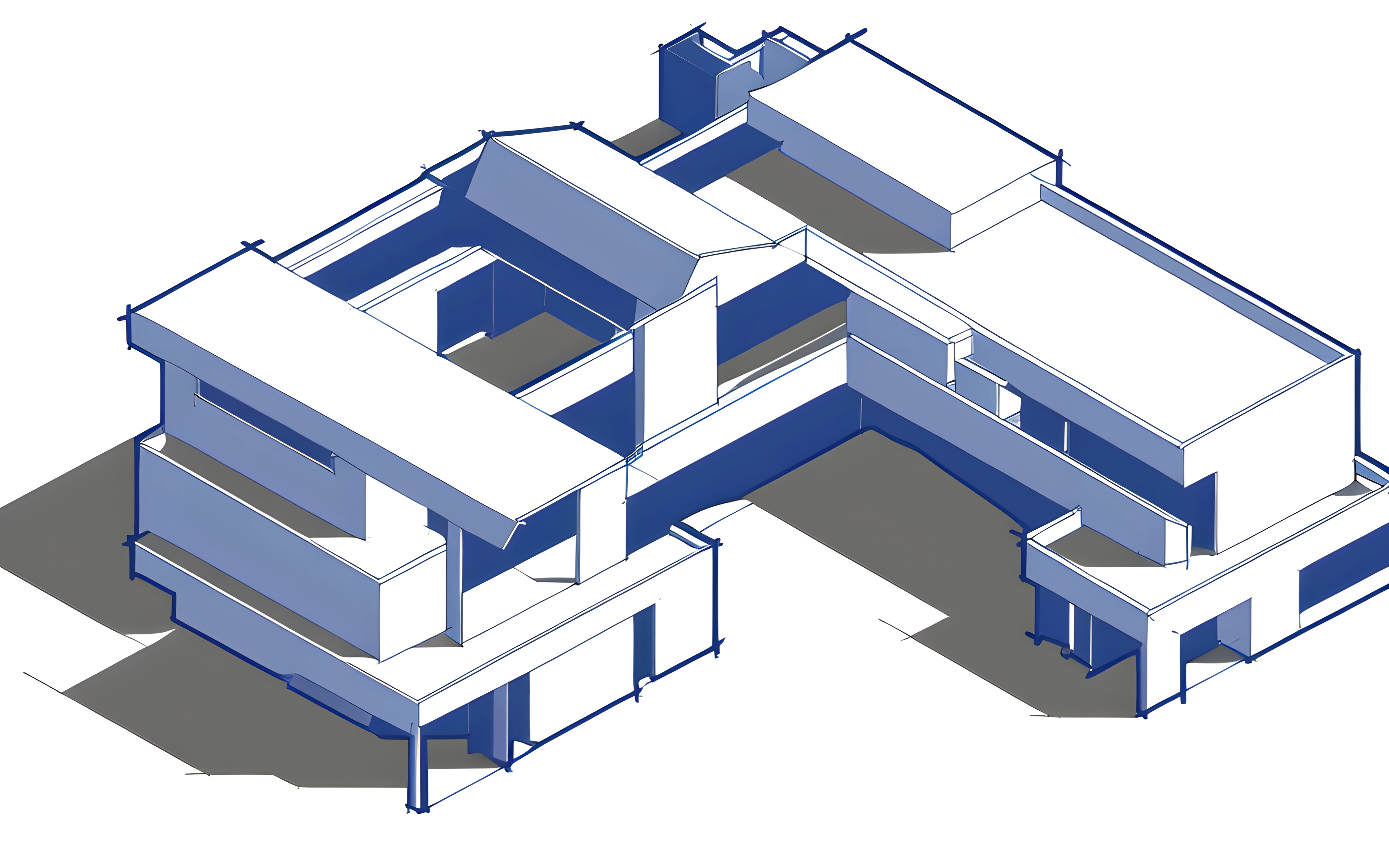 Tikuai, architecture blocks, line draft, simple color, blue style, shadow of architecture,white background
